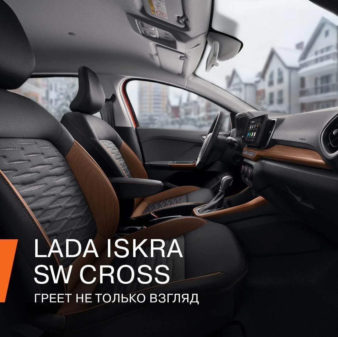 Но LADA Iskra греет нас не только своими зимними опциями, но и просто ярким обликом! Особенно когда на улице появляется универсал Cross в фирменном цвете «Табаско». Огненный колер перекликается с рыже-бронзовыми вставками в интерьере.