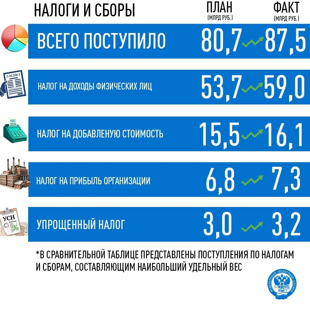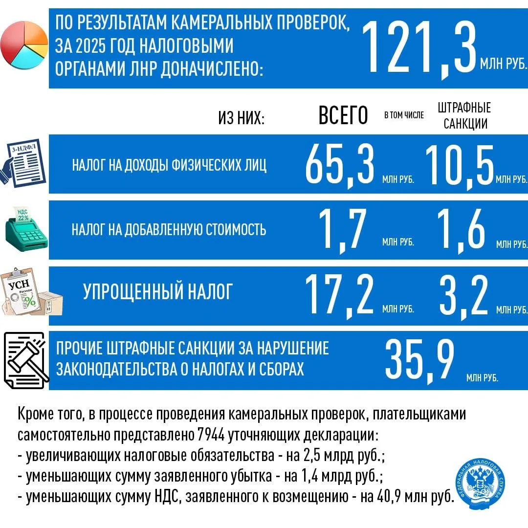 ↗️ ЛНР перевыполнила плановые показатели по налоговым поступлениям в 2025 году на 108,7%, в минувшем году в Республике собрали 87,5 мрлд рублей налогов и сборов, из них налог на доход физлиц составил 59 млрд. Об этом сообщили в Укправлении Федеральной налоговой службы по ЛНР.