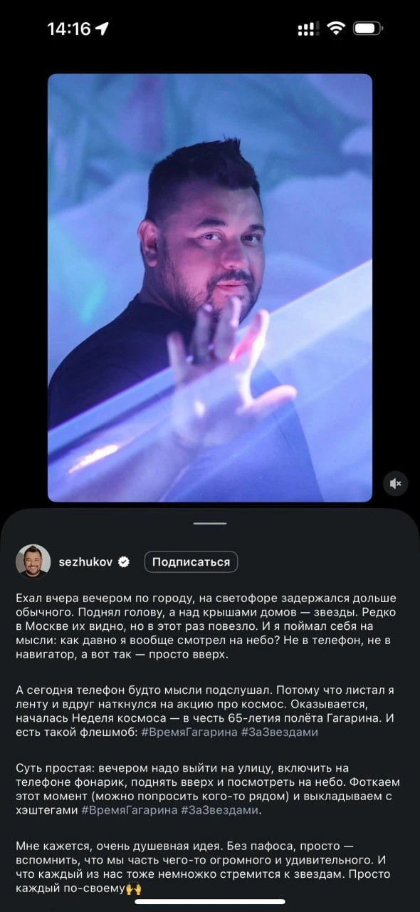 65 лет назад Юрий Гагарин открыл человечеству дорогу к звёздам. Акция #ВремяГагарина #ЗаЗвездами вышла за пределы Земли. Экипаж МКС, блогеры и артисты присоединяются один за другим. Всё это часть первой в истории «Недели космоса», которую назначил Президент России Владимир Путин.