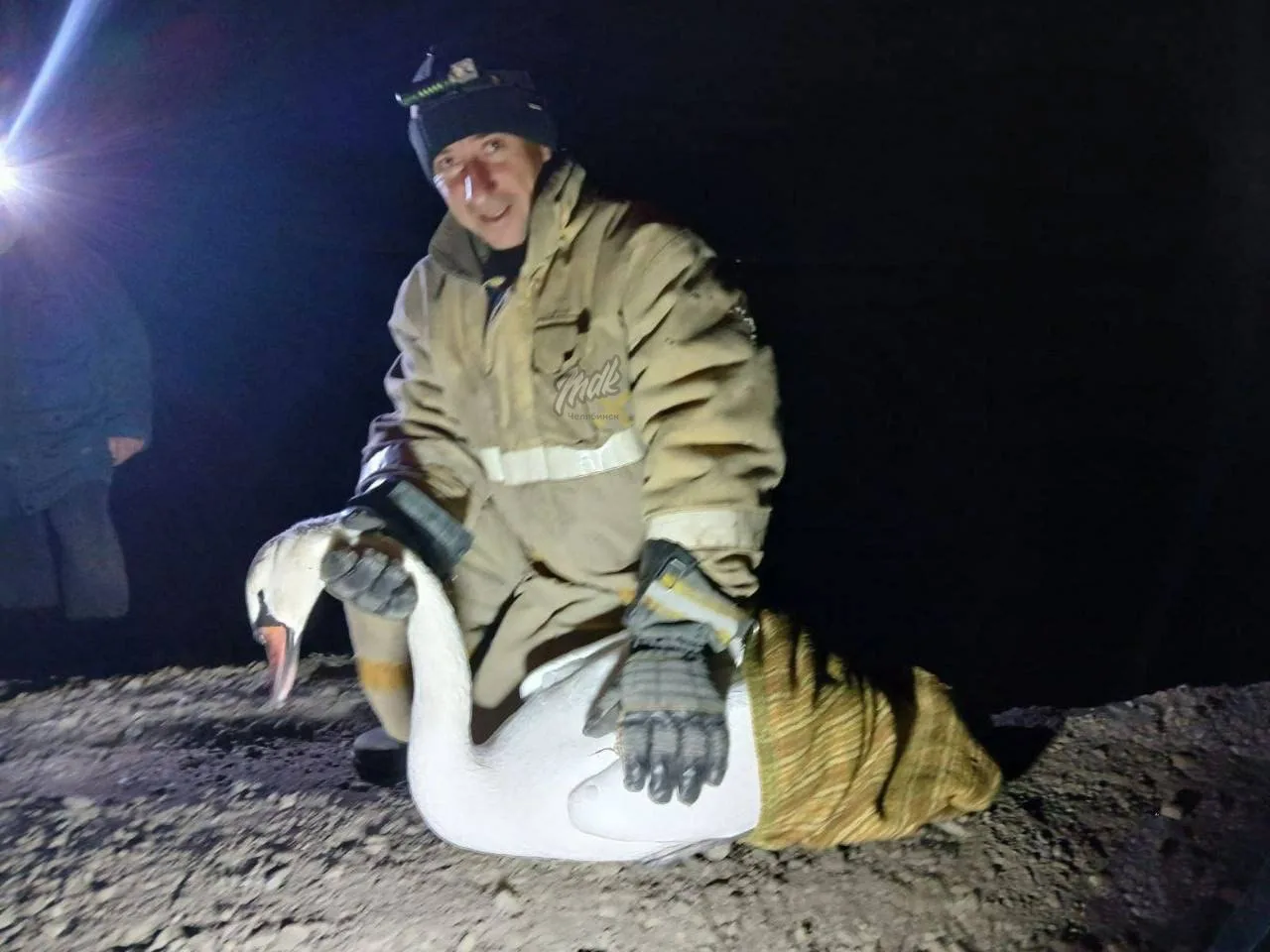 Птица оказалась в ловушке примерно в 100 метрах от берега. Сотрудники МЧС подплыли к ней на лодке, аккуратно вырубили лёд, укутали лебедя в плед и вывезли на сушу.