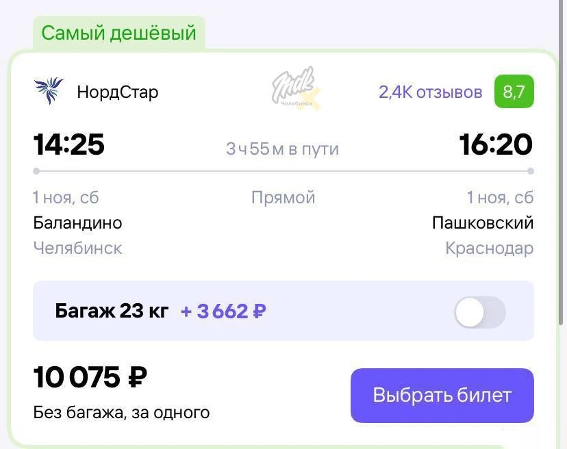 С 1 ноября авиакомпания NordStar запускает еженедельные прямые рейсы. Время в пути — 3 часа 55 минут.