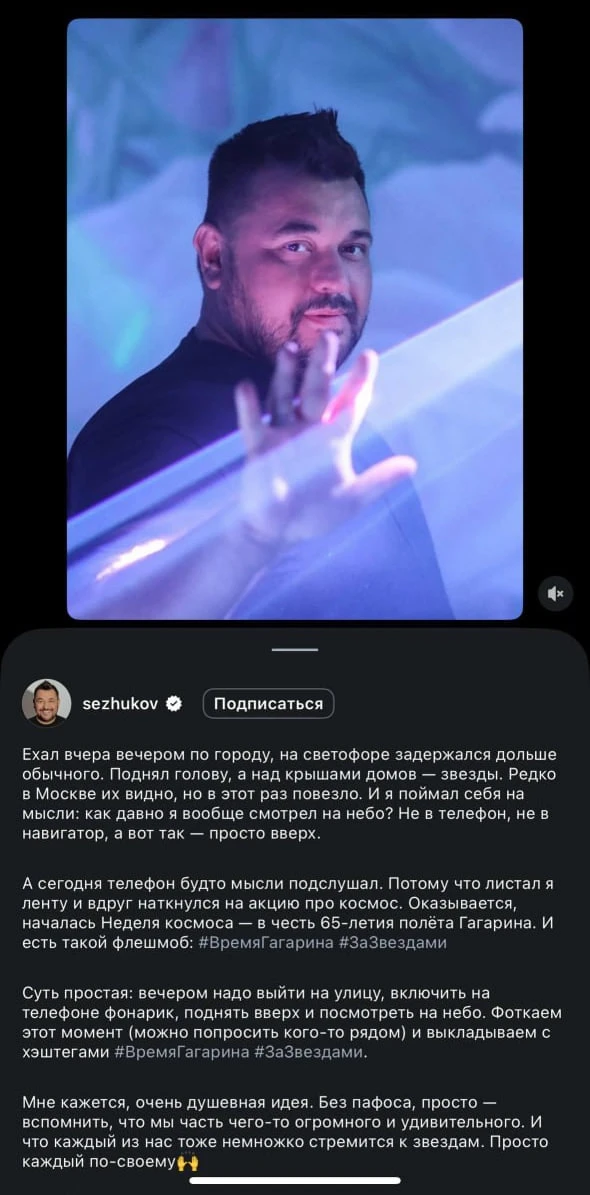 Акция приурочена к 65-летию полёта Юрия Гагарина. В честь праздника запустили флешмоб #ВремяГагарина и #ЗаЗвездами — к нему уже подключились даже космонавты на МКС.