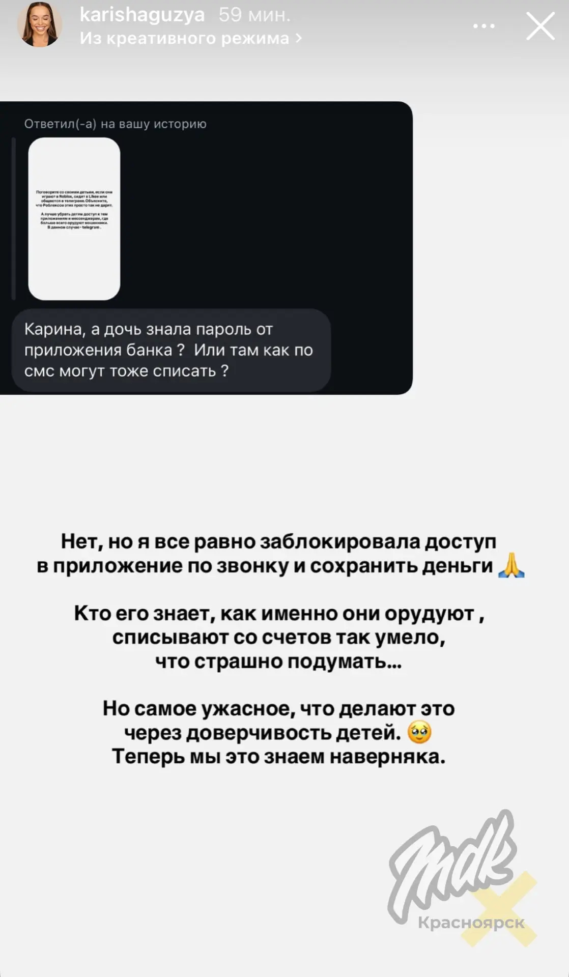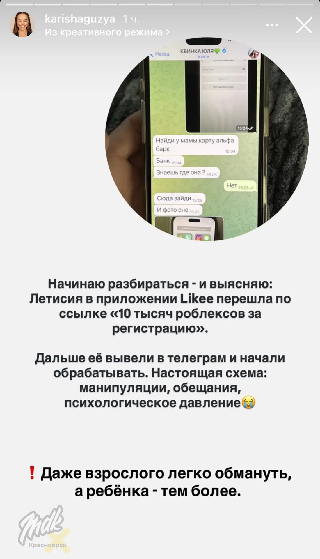 Карина Гузиковская рассказала, что злоумышленники обманули её ребёнка, пообещав халяву в «Роблоксе». Девочка перешла по ссылке и наткнулась на ТГ-мошенников, которые начали её «обрабатывать» и пытались выведать данные маминой карты.