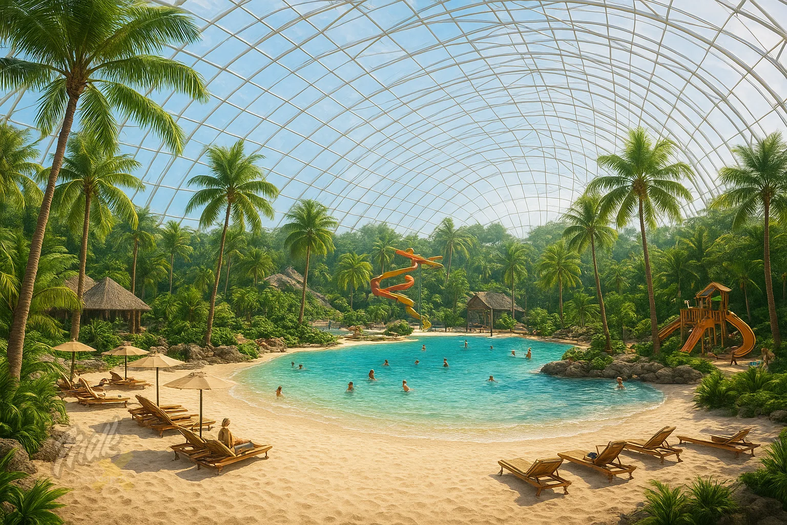 По проекту внутри будет настоящий рай — водная зона с пляжем, фудкорты, детские площадки и аттракционы. Рассчитано всё на 2 тысячи человек.