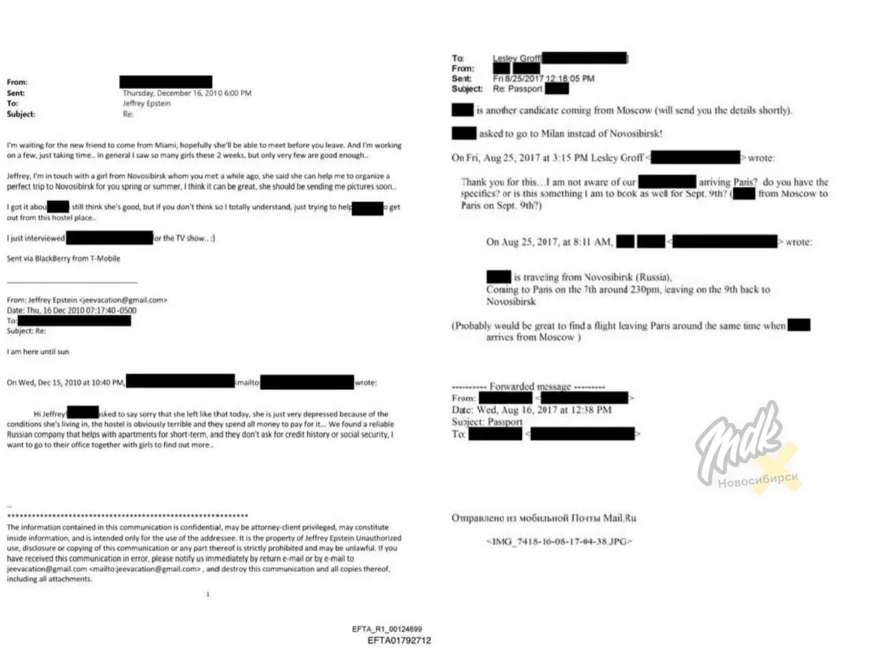 В документах Минюста США описаны поездки, которые в 2017–2019 годах организовывала 24-летняя Дарья Б. из города Обь: она искала кандидаток и обсуждала с окружением Эпштейна визы и финансирование. Установлены минимум четыре девушки, которые летали в Париж на короткие визиты, но, по другим данным, эту информацию считают ложной, а сама Дарья исчезла из соцсетей.