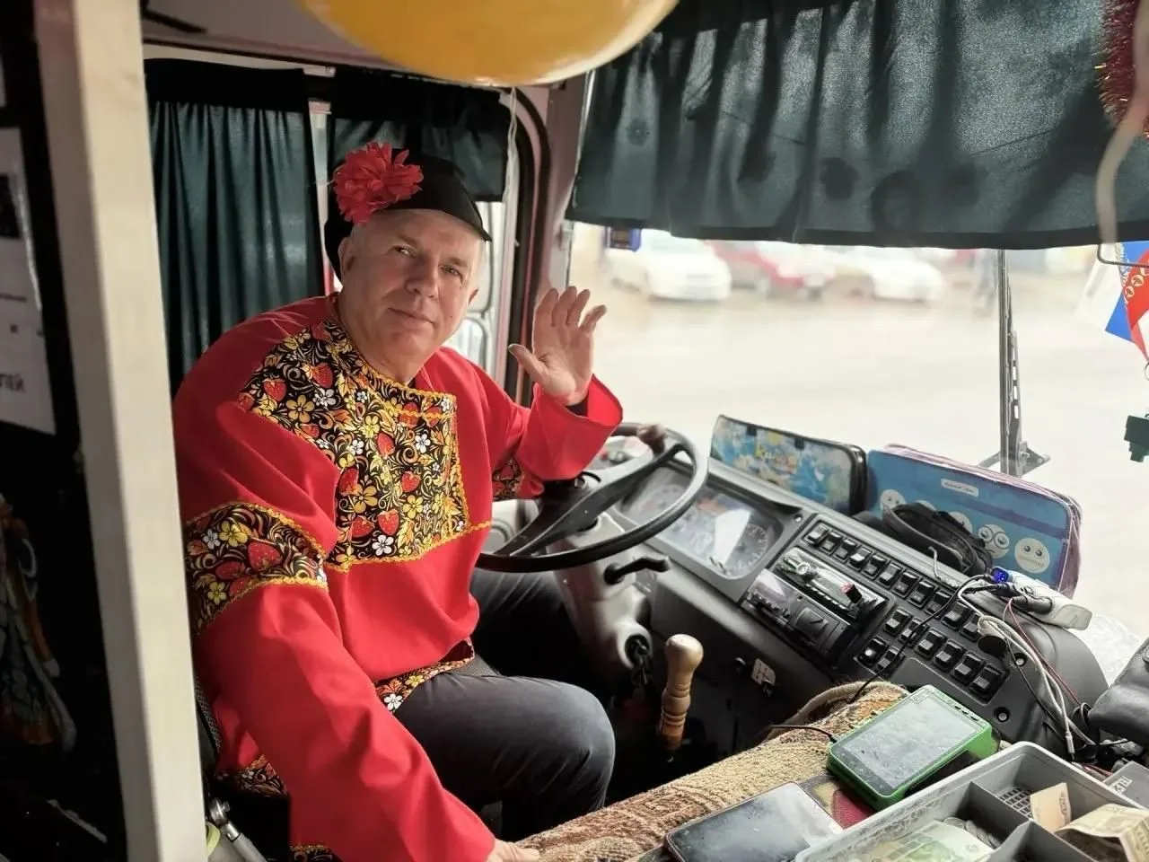 Водитель нарядил автобус к Масленице, а сам вышел на линию в праздничном образе. А блины напекла его жена.