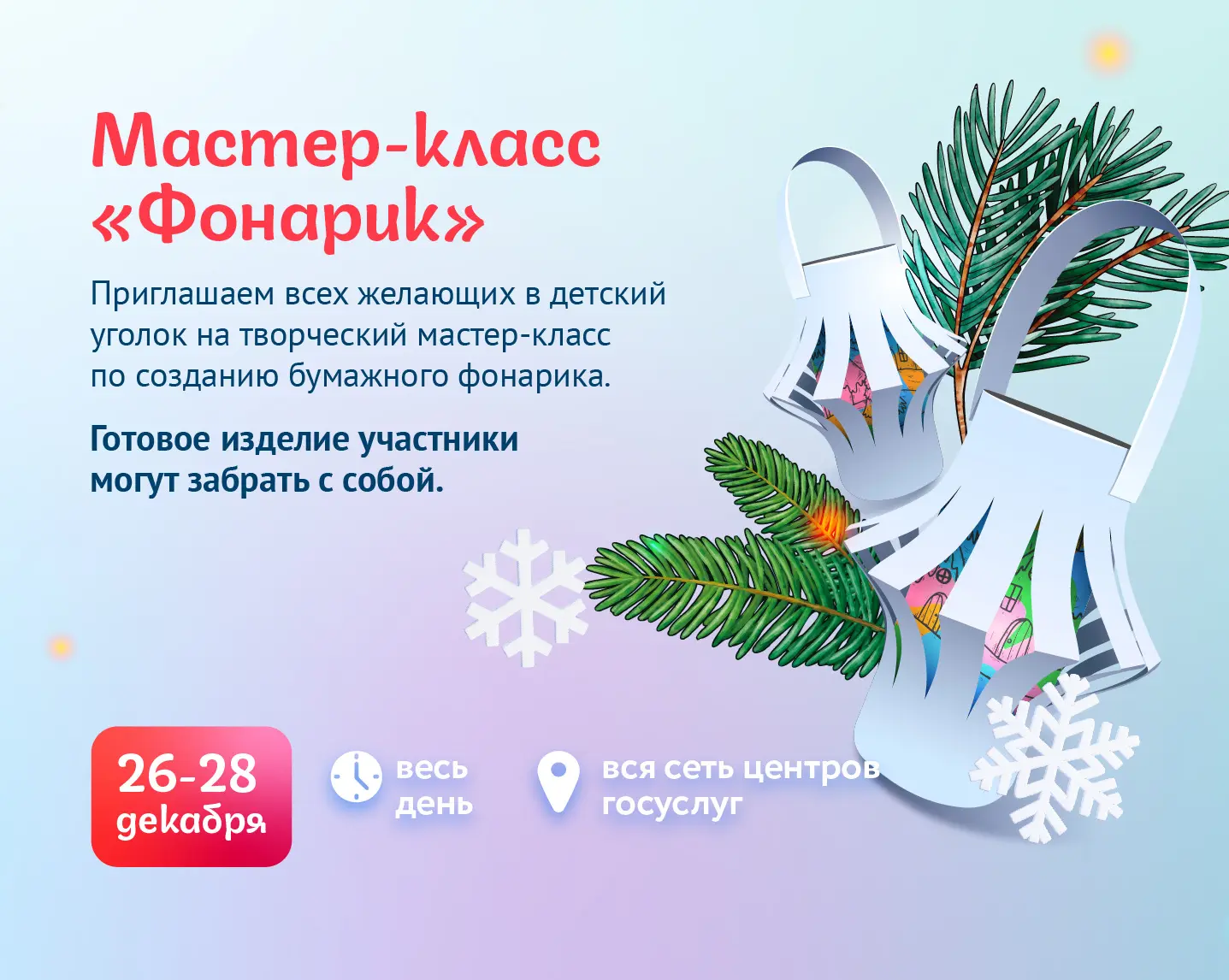 • 26–28 декабря во всех центрах госуслуг — мастер-классы по бумажным фонарикам в детских уголках.