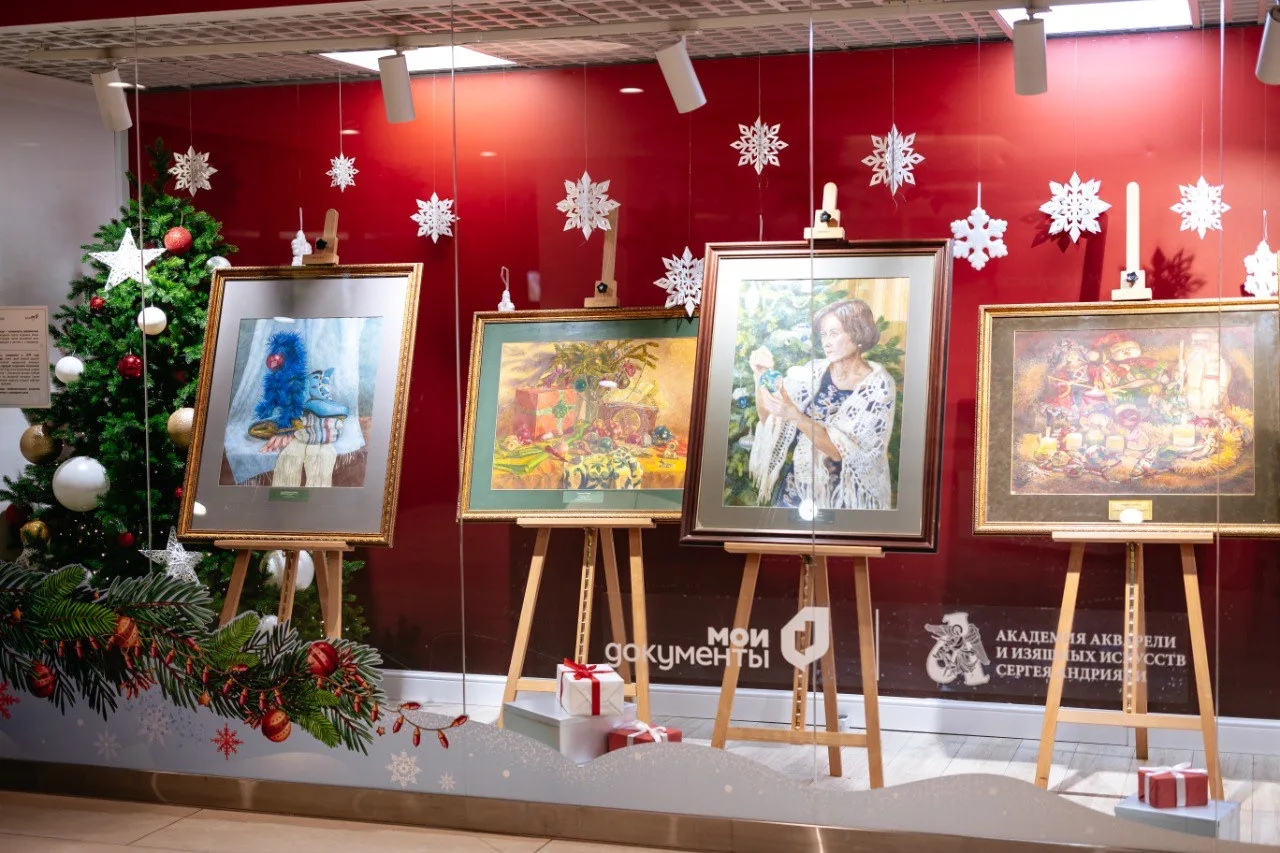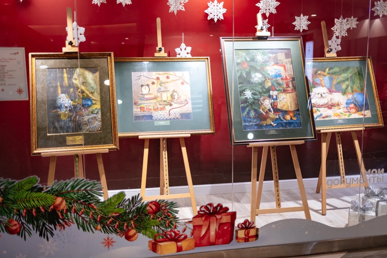 Во флагманском офисе САО в сотрудничестве со Школой акварели Сергея Андрияки открылась выставка картин ее учеников! Новогодние сюжеты в витрине — магия праздника 🎄✨