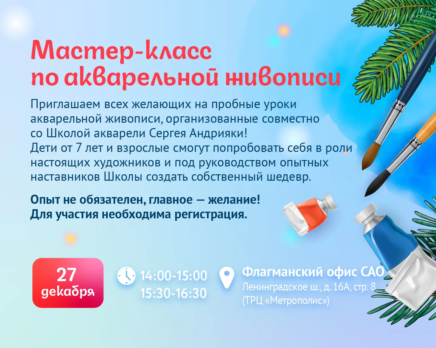 • 27 декабря во флагмане САО — мастер-класс по акварельной живописи. Запись обязательна.