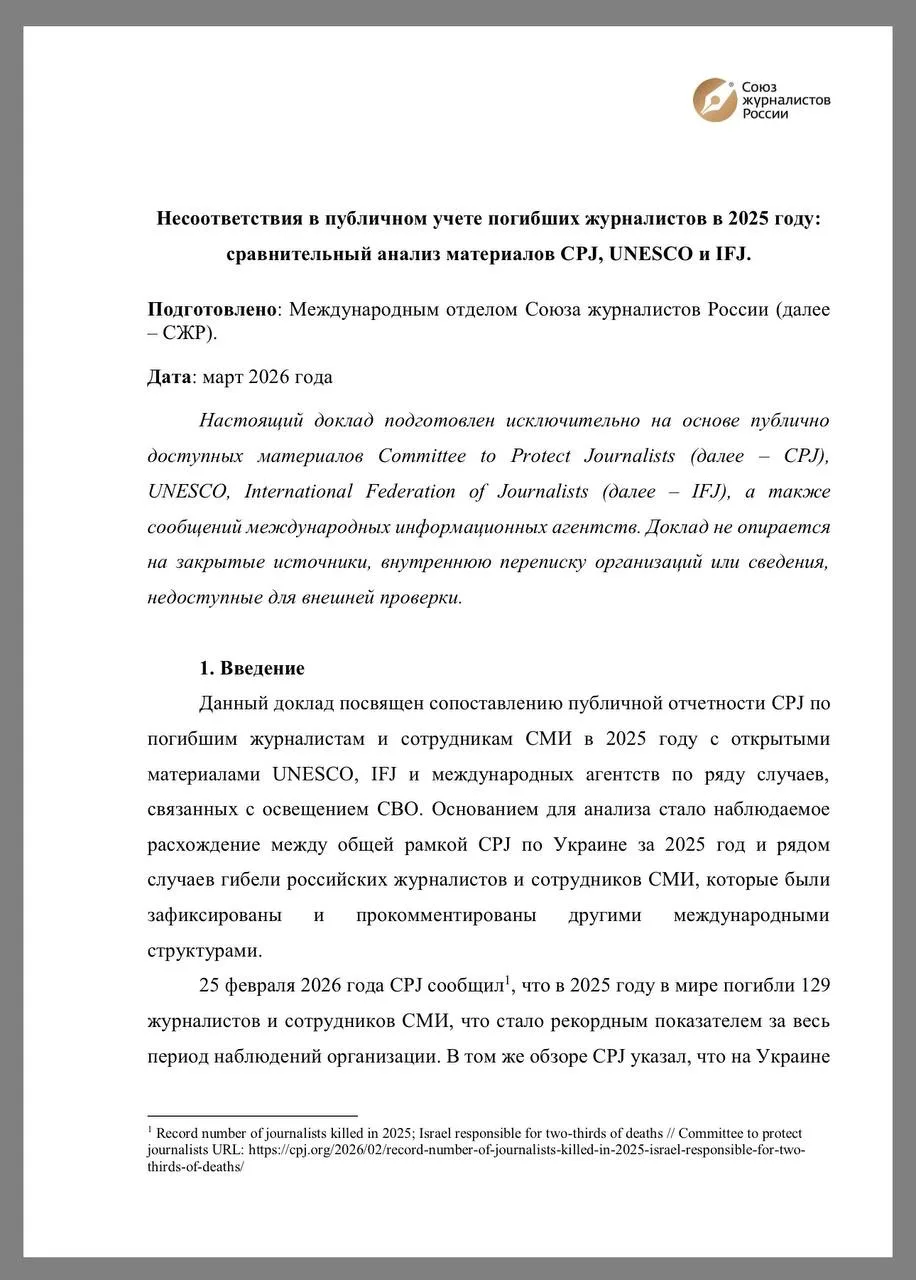 📄Посольство России в Бельгии направило Президенту Международной федерации журналистов Д.Прадалие текст подготовленного Союзом журналистов России доклада – «Несоответствия в публичном учёте погибших журналистов в 2025 году: сравнительный анализ материалов CPJ, UNESCO и IFJ».