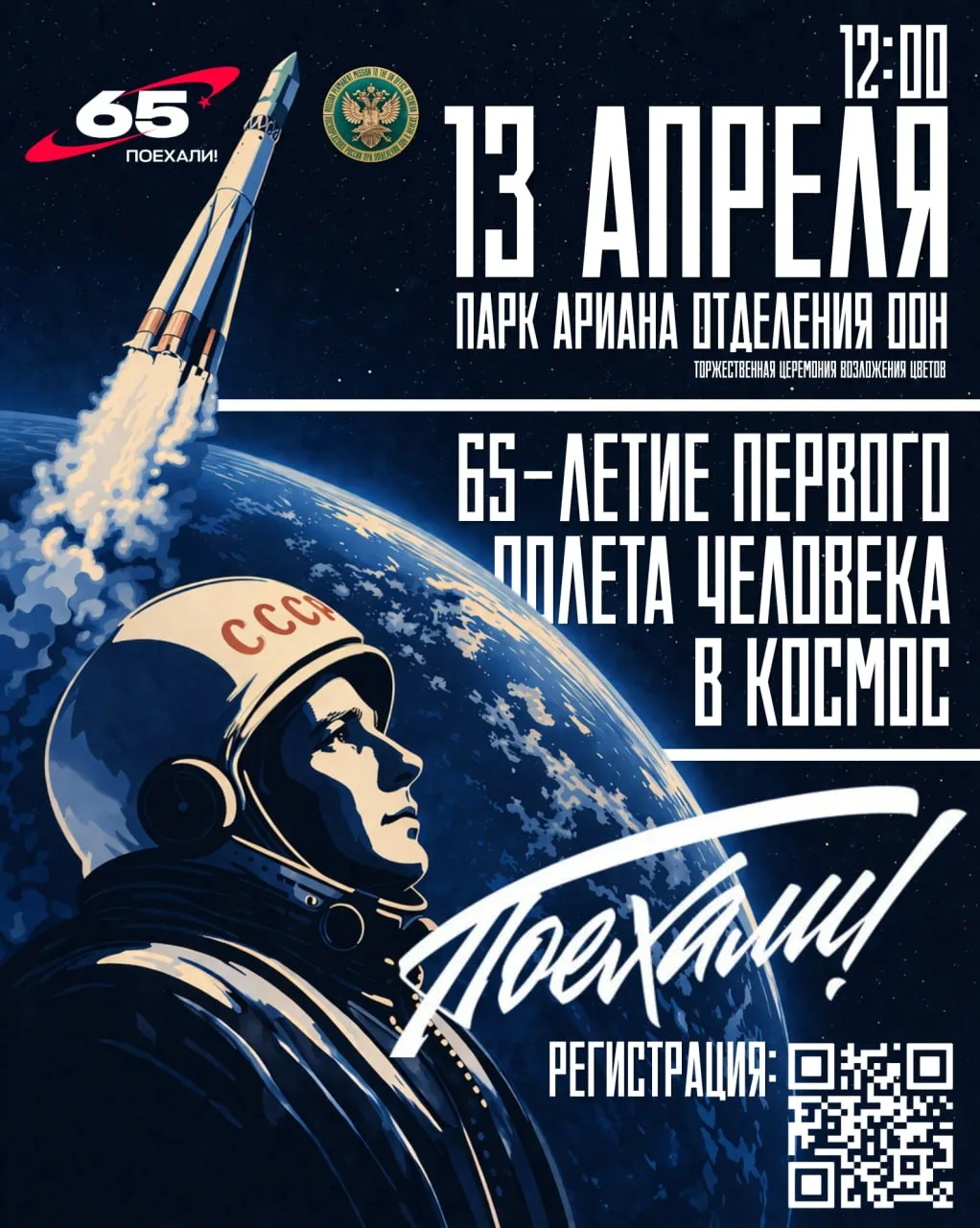 13 апреля 2026 г. в Отделении ООН в Женеве (парк Ариана) пройдёт торжественная церемония возложения цветов к монументу «Покорение космоса» в честь 65-летия первого пилотируемого космического полета, совершенного Ю.А.Гагариным. С приветственной речью выступят Постпред России при Отделении ООН в Женеве Г.М.Гатилов и Генеральный директор Отделения ООН в Женеве Т.Д.Валовая.