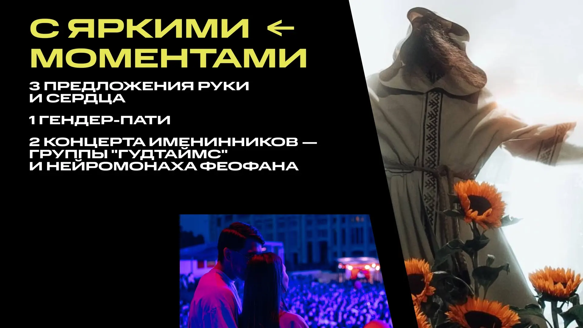 ▫️шоу-программы и сцены под разное настроение — от холодных огней до «мокрых маек», предложение руки и сердца, гендер-пати и презентации песен.