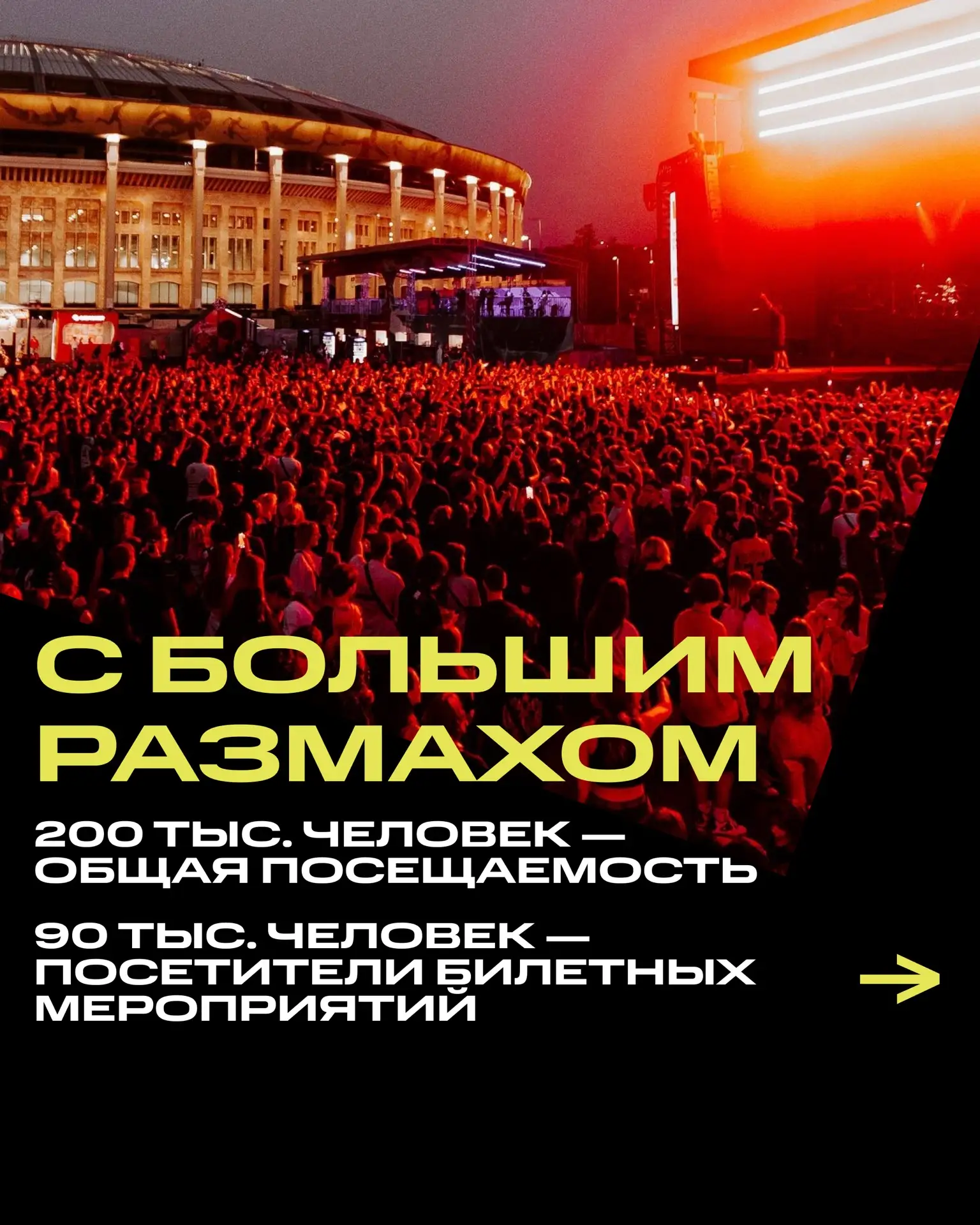 На одной из крупнейших летних площадок Москвы — «Лужниках» — мы собрали тысячи зрителей и подарили им незабываемые вечера.
