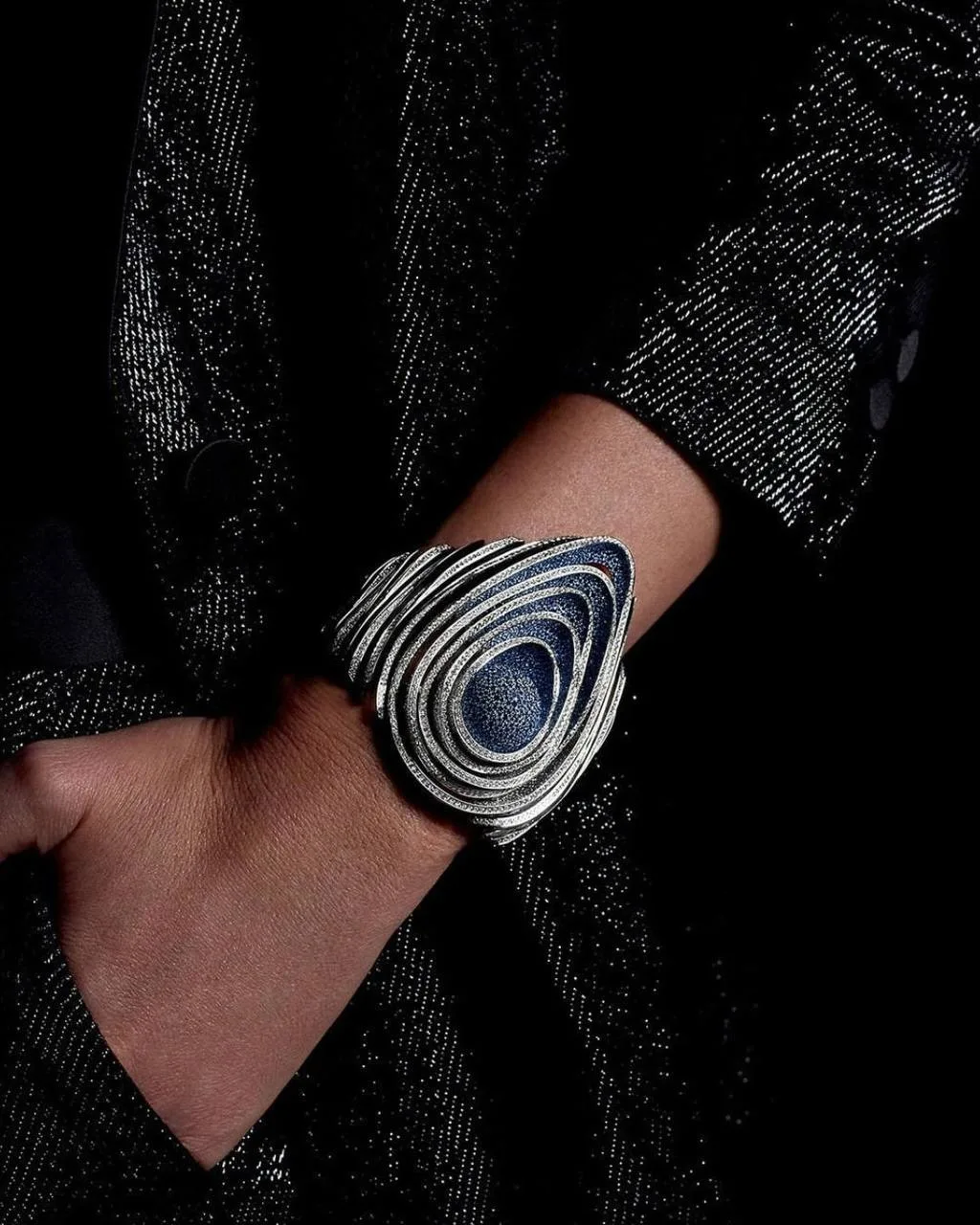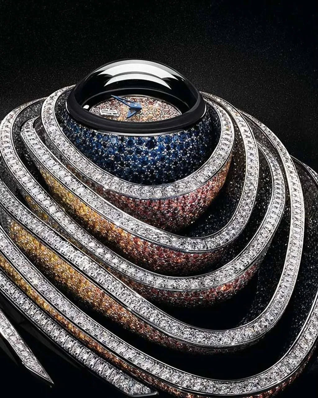 У Audemars Piguet вышло что-то на космически красивом и богатом. Модель называется Sapphire Orbe. Играет с темой ночи и дня создавая иллюзию текущей реки вокруг запястья. Теперь о самом интересном — тут больше 12 000 драгоценных камней. Каждый подогнан под размер и вставлен вручную. Работа заняла больше 1 000 часов. Цена вопроса — примерно миллион долларов, точнее вам скажут в бренде.