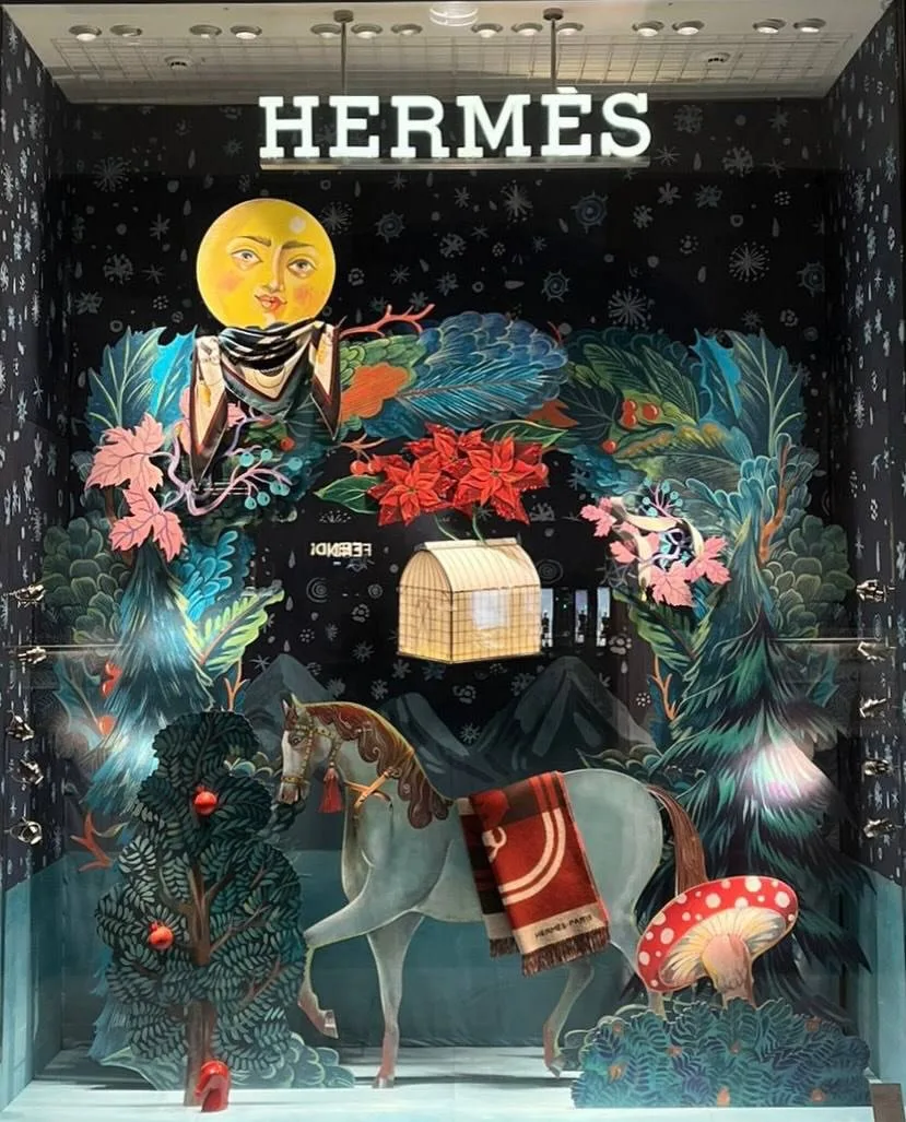 Для оформления праздничных витрин в бутиках Германии, Вены, и Праги Hermès пригласил немецкого иллюстратора Олафа Хайека. Сотрудничать с художниками в зимний сезон бренды любят, и дают им свободу действий. В результате получаются красивые витрины с некоторой долей сюрреализма.
