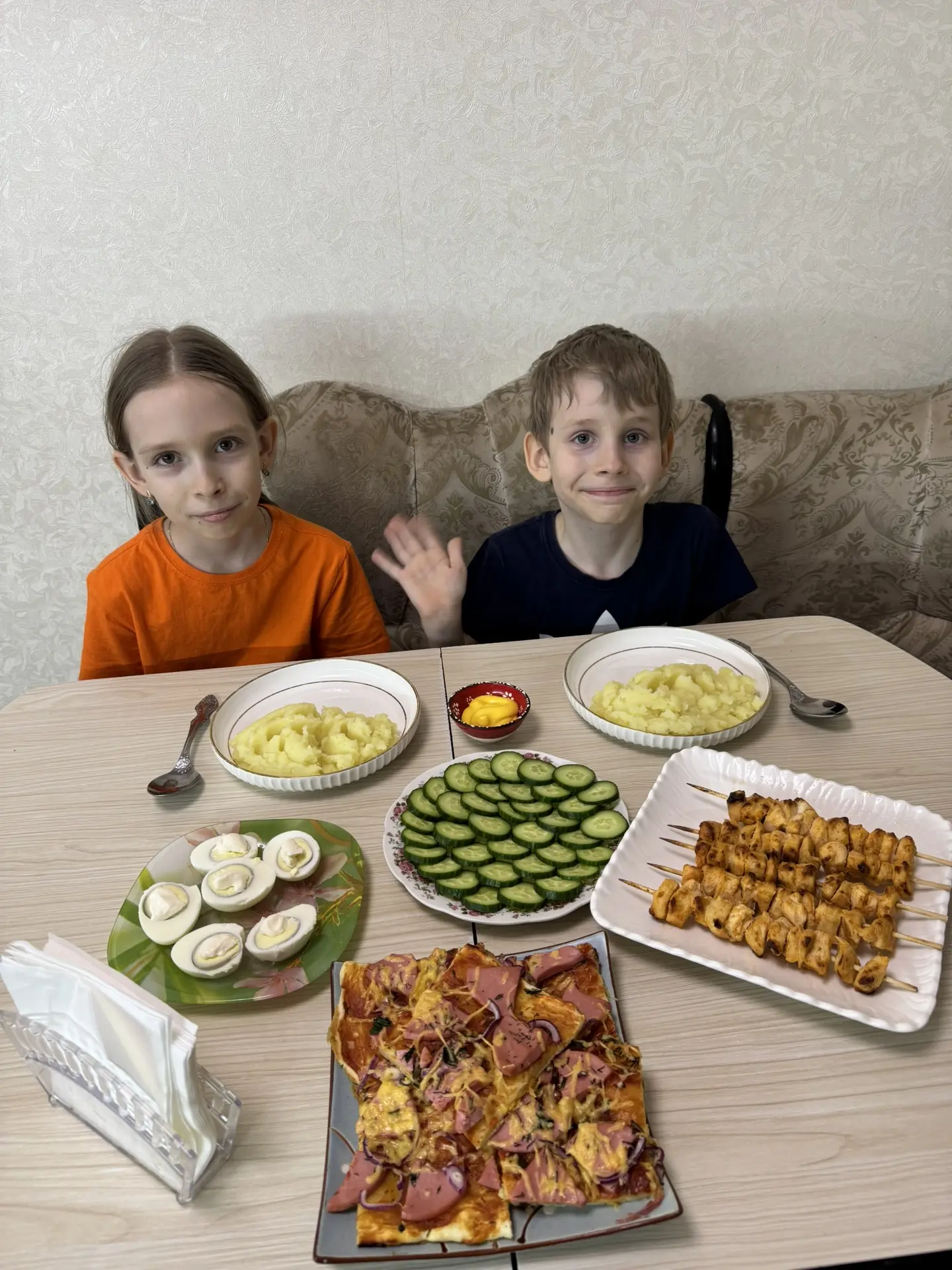 А у детей ужин, Юра только пиццу поел, а я помело буду чистить себе 😉