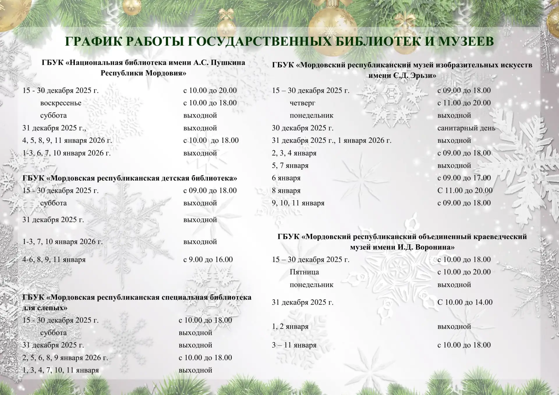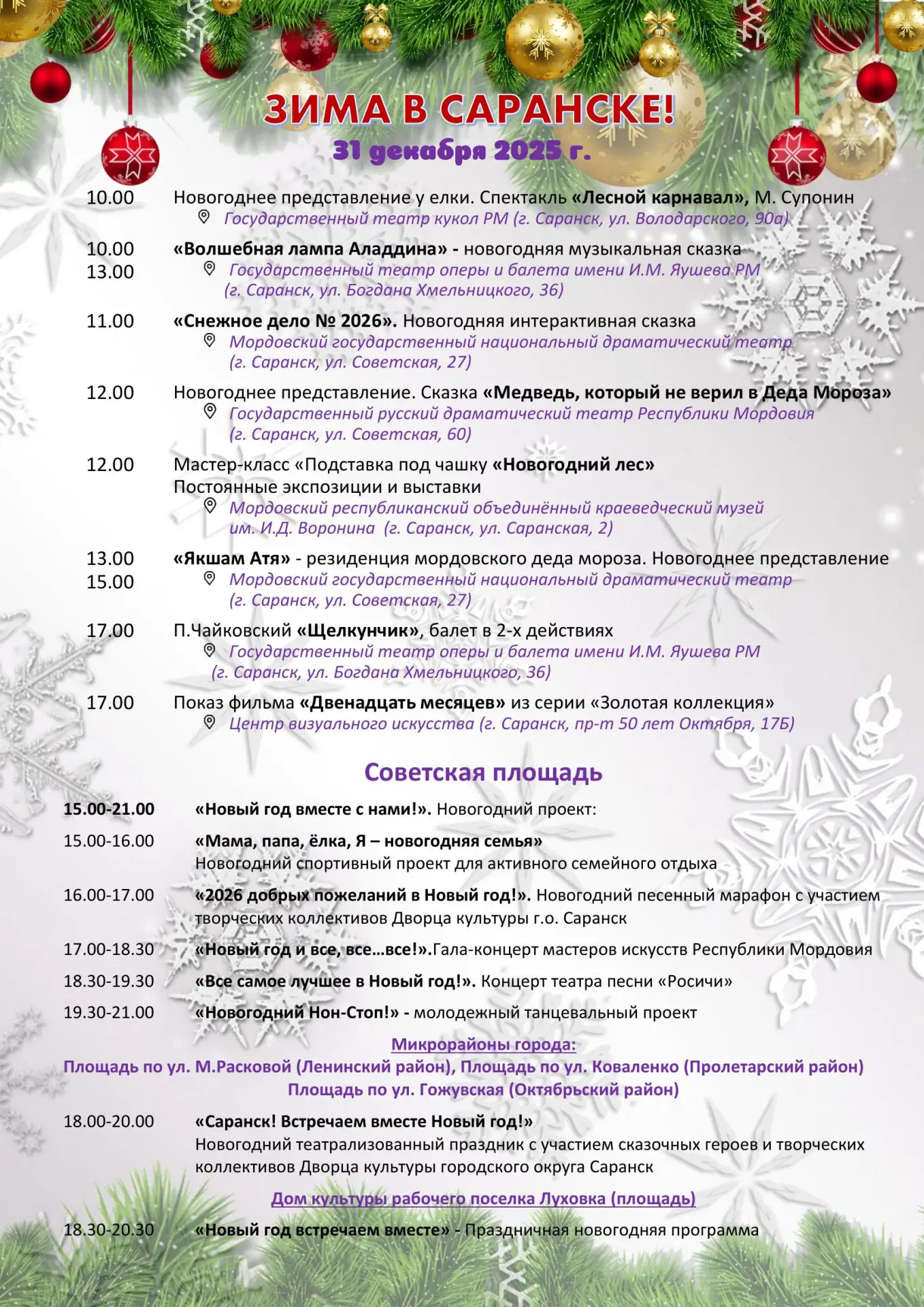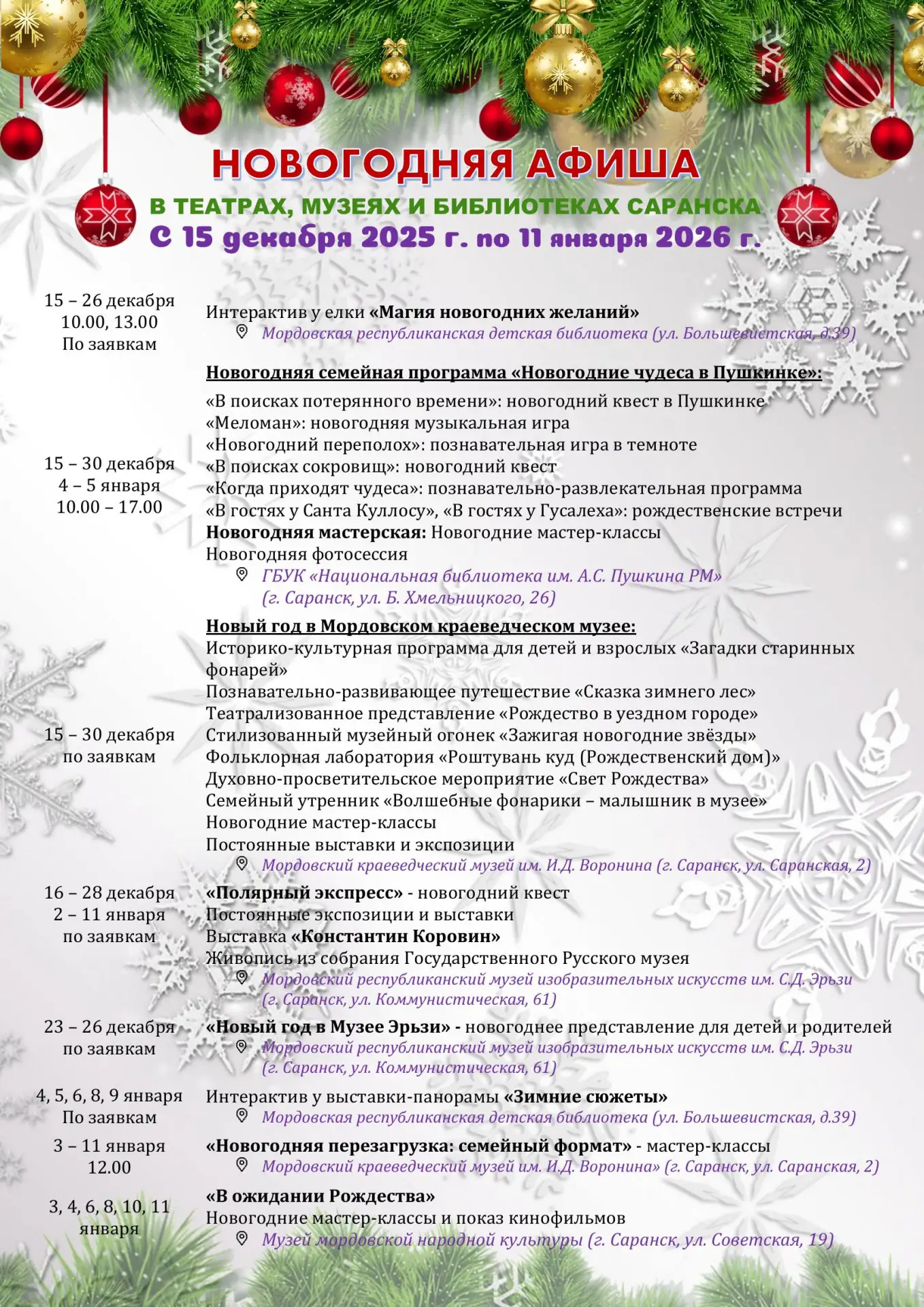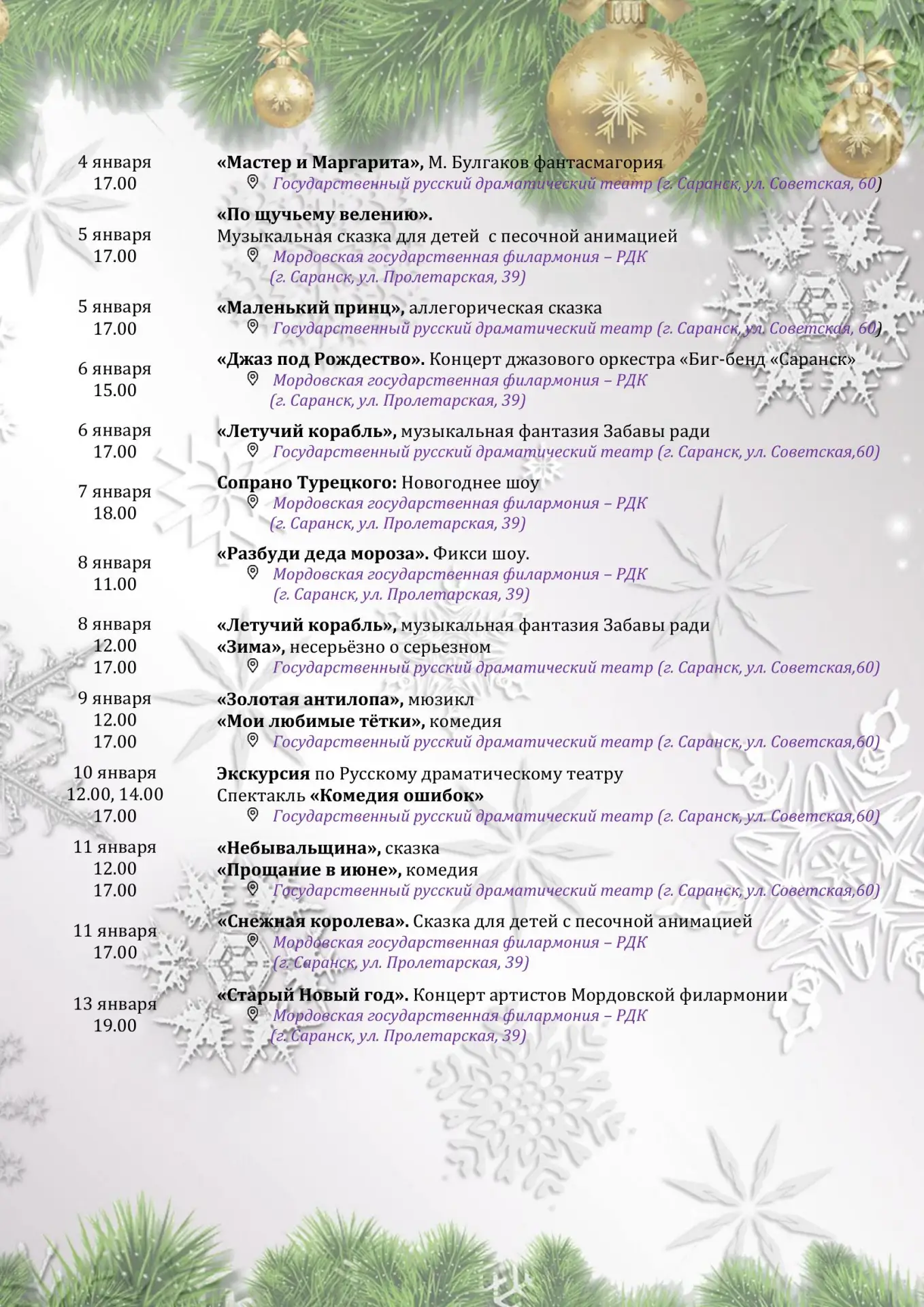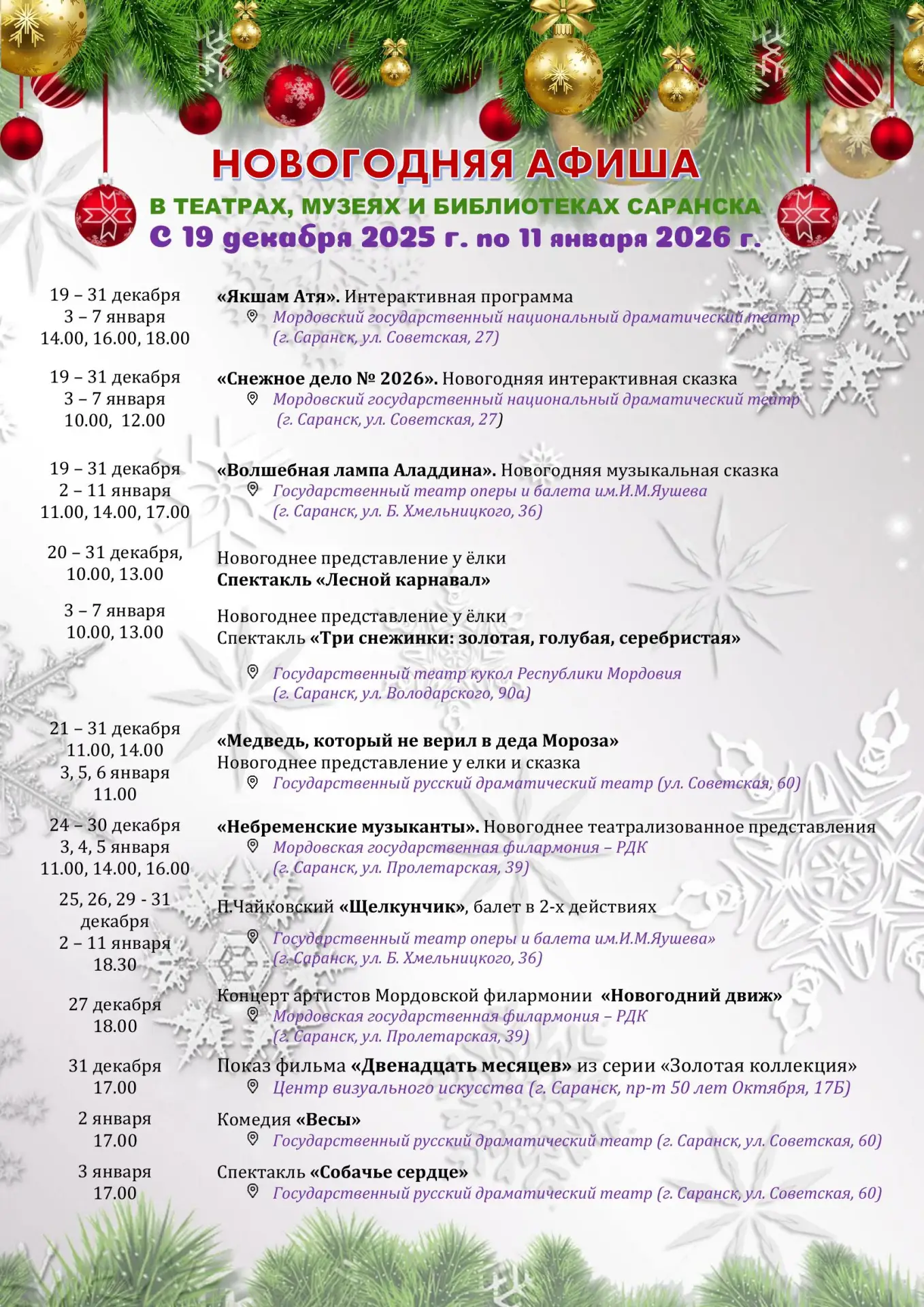 Подробная афиша с 19 декабря по 11 января в театрах, музеях и библиотеках Саранска - в прикрепленных файлах