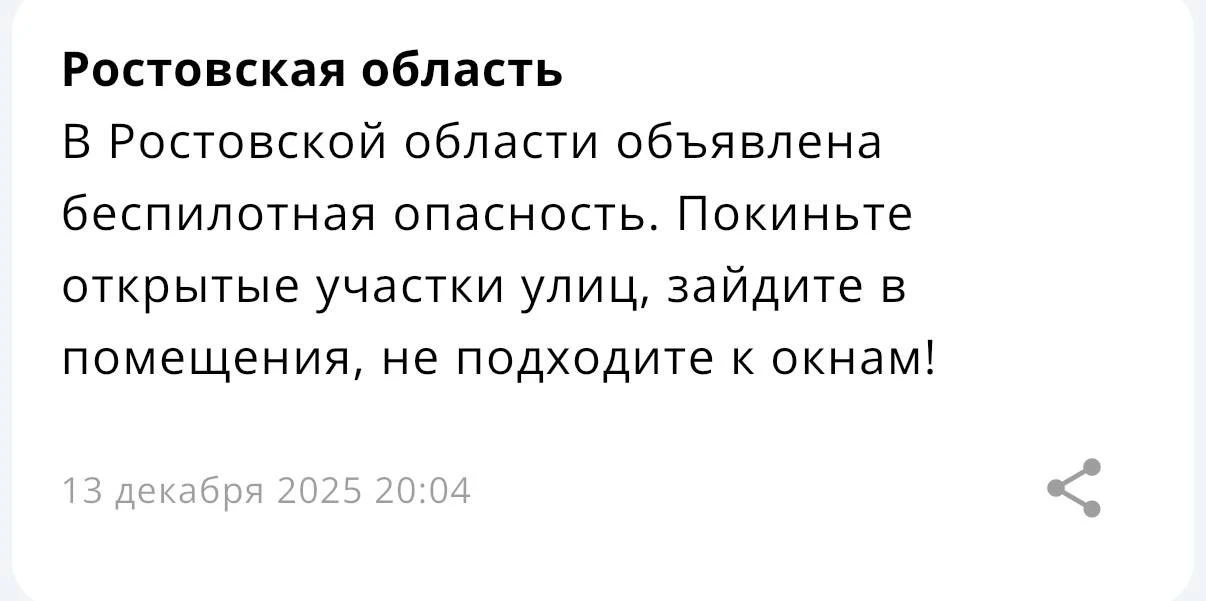 Объявлена беспилотная опасность по всей Ростовской области! Рекомендовано покинуть открытые участки улиц, зайти в помещения и не подходить к окнам! Соблюдайте меры безопасности!