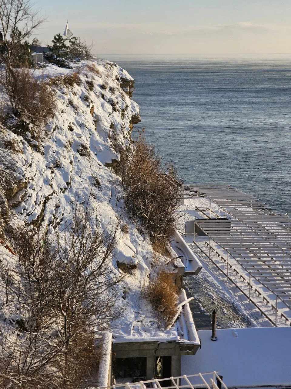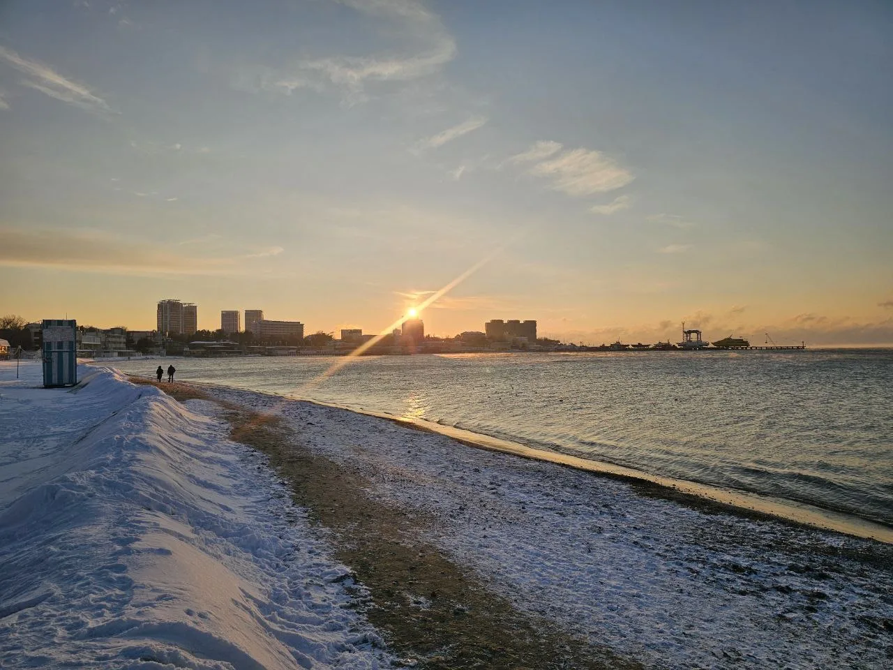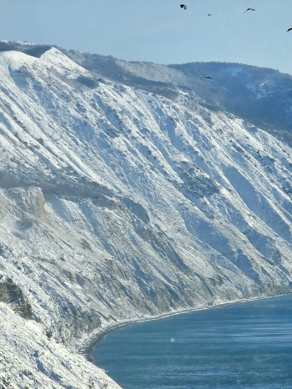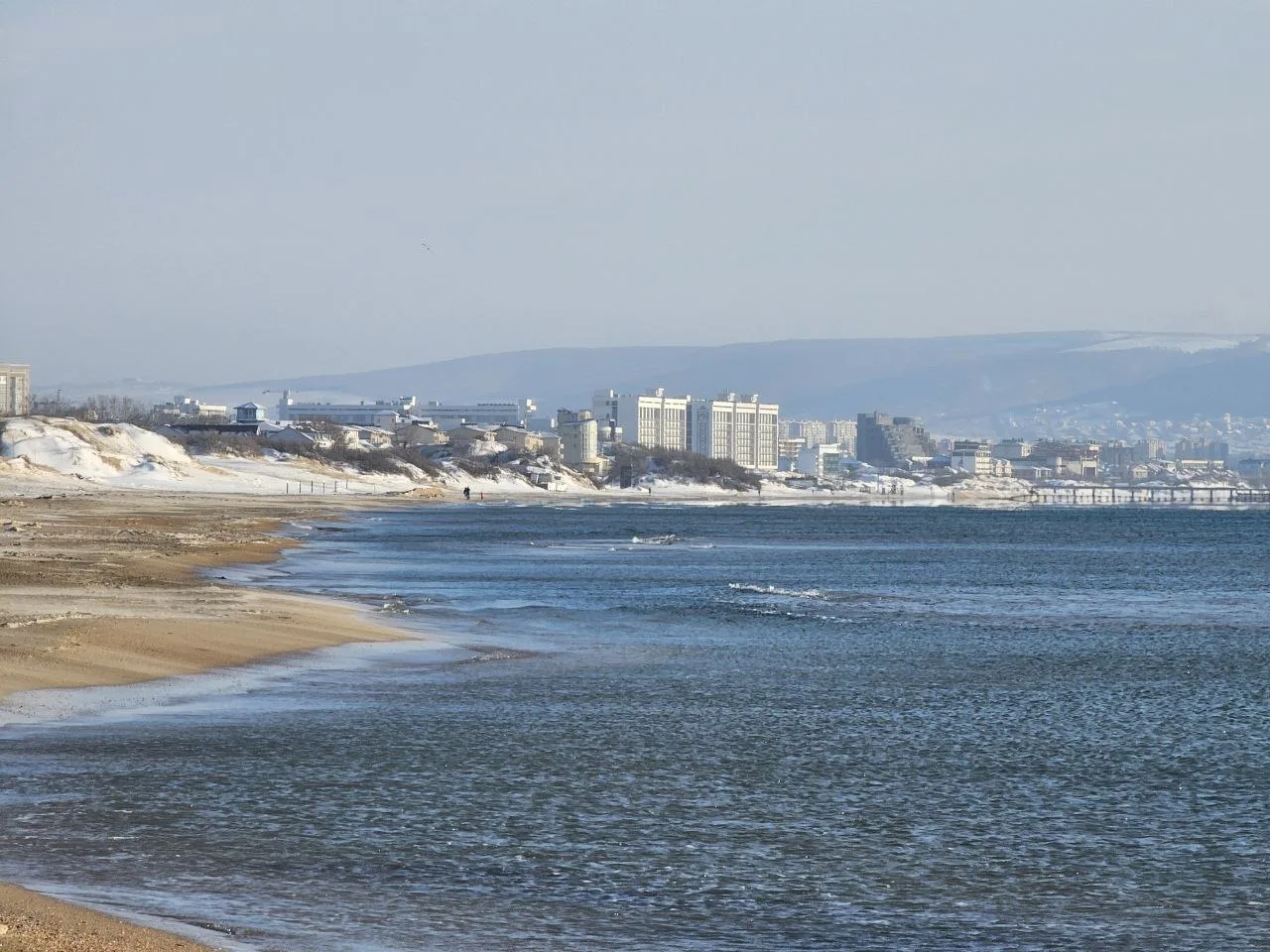 Посмотрите какое кайфовое чистое море и немного заснеженный берег.