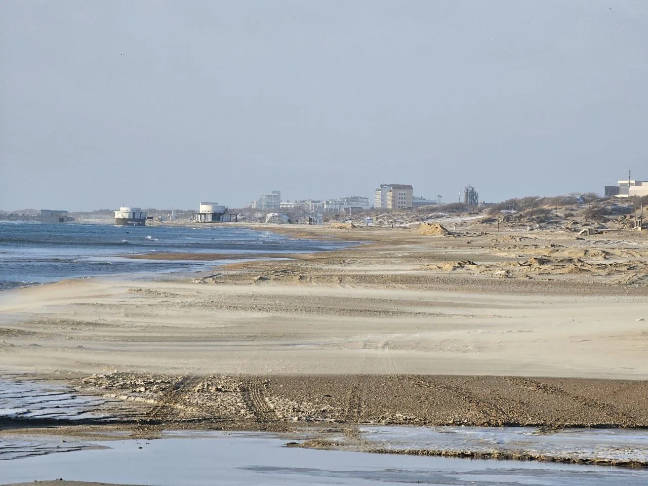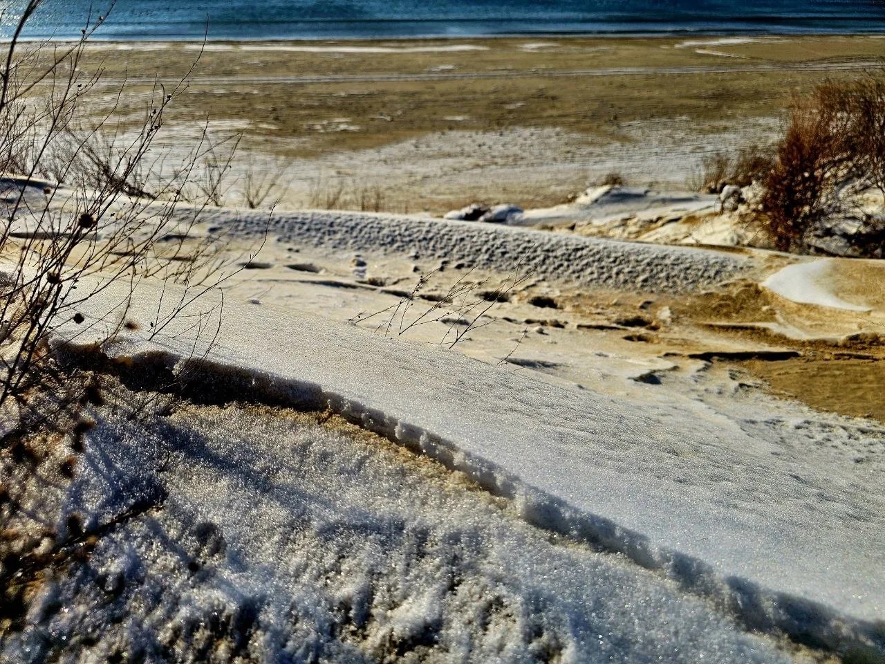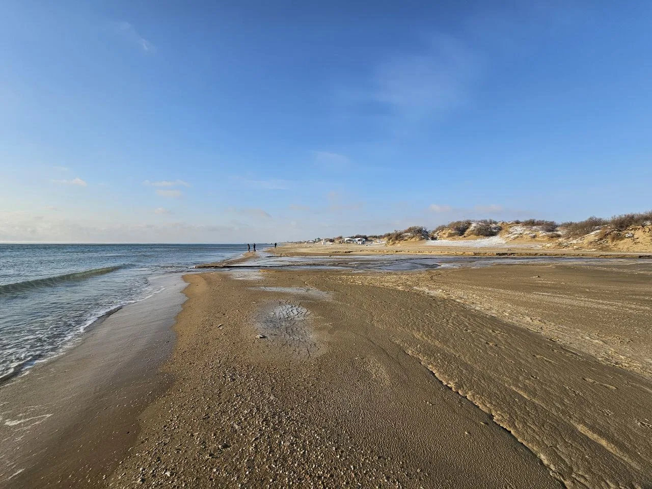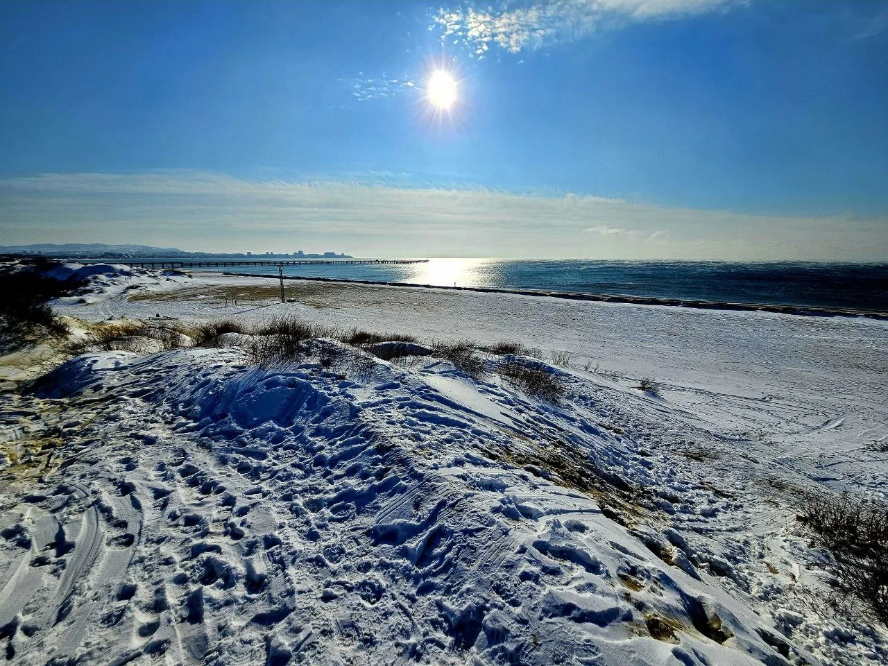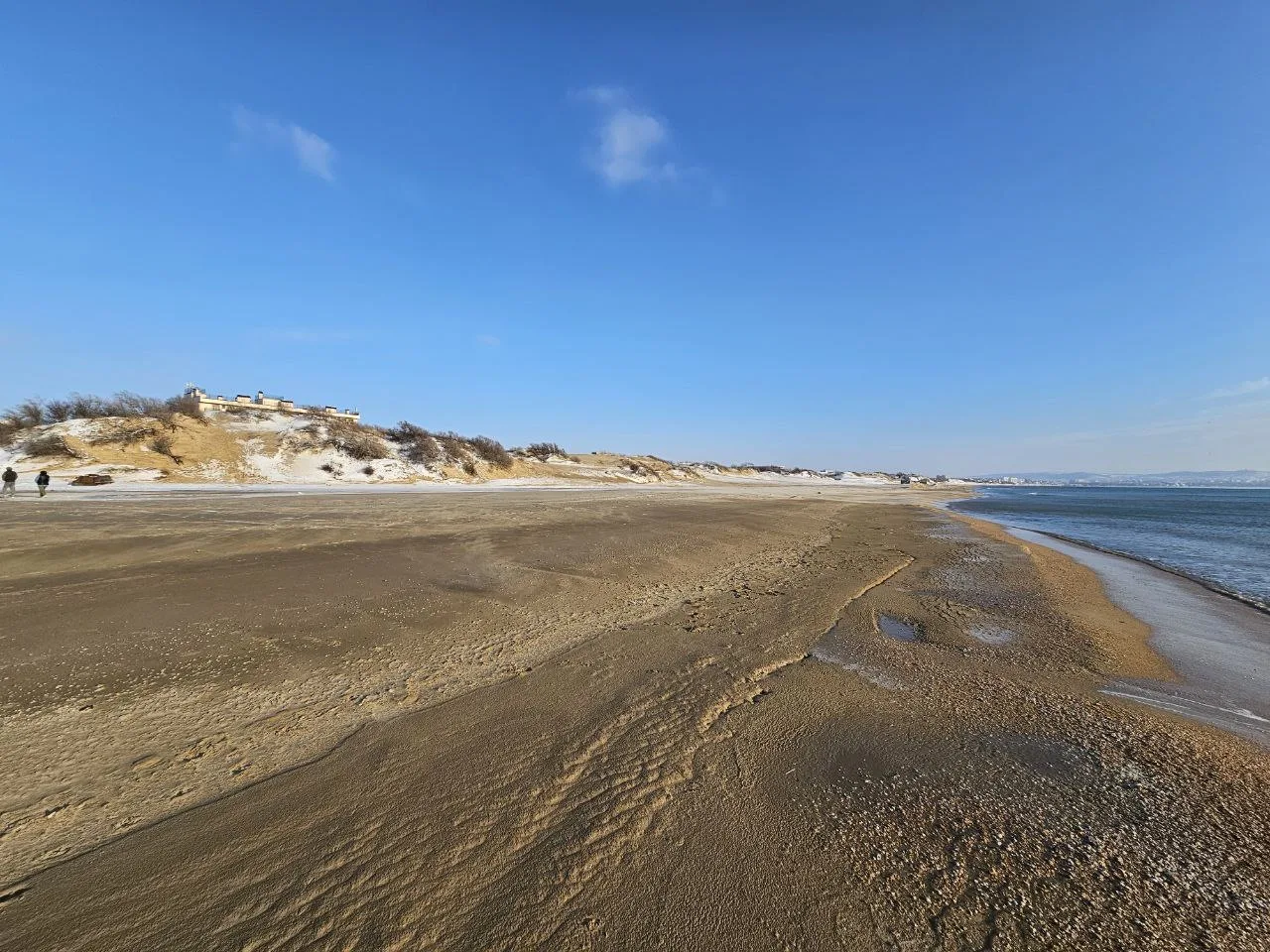 Вид на заснеженные пляжи #Джемете с дюн на Золотистом проезде, дальше снега гораздо меньше, тут своеобразная линия зимы и весны.