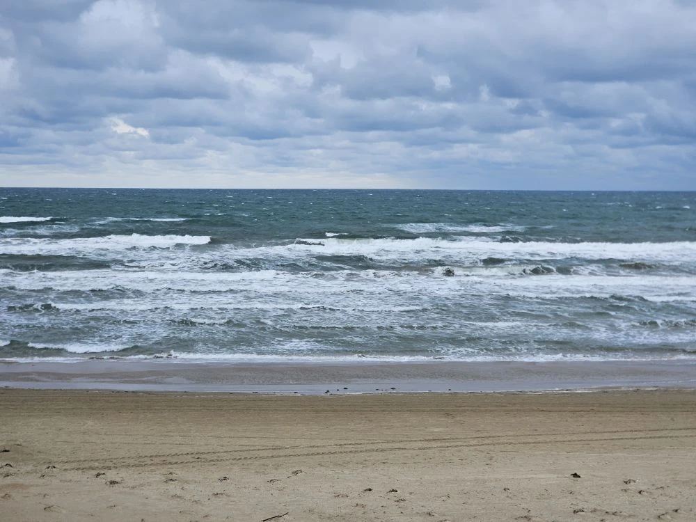 Идёт дождь, море волнуется и летит песок. Экстримальная обстановка на пляже.
