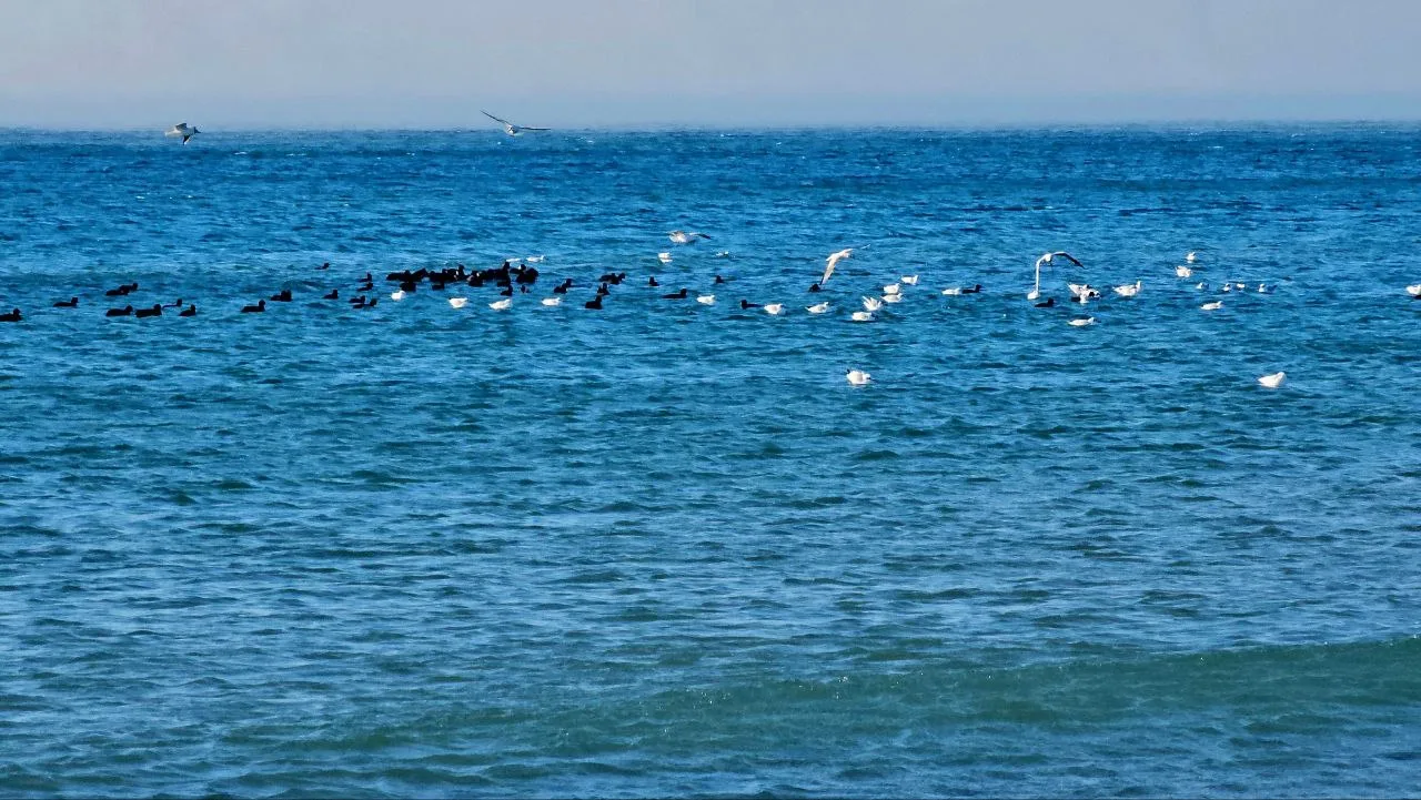 Дети и взрослые катаются с дюны, птицы плавают в море, все прекрасно!