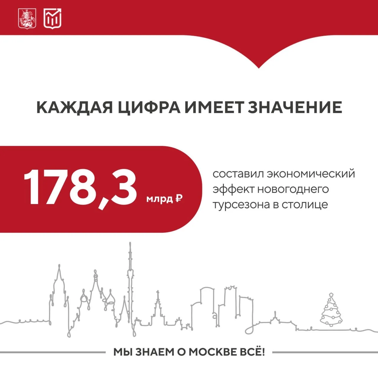 Зима в Москве проходит активно! В новогодние и рождественские праздники вклад туризма в экономику столицы составил 178,3 млрд ₽. Это в сопоставимых ценах на 20% больше, чем годом ранее. В период новогодних каникул столицу посетили 8,2 млн гостей. Город радовал гостей и жителей города яркими украшениями и насыщенной программой. Например, на площадках проекта «Зима в Москве» прошло 10 тыс. мероприятий, в которых приняли участие 11,9 млн человек.