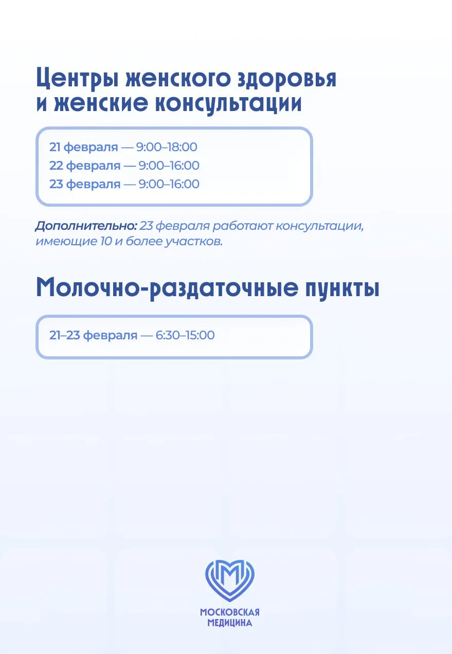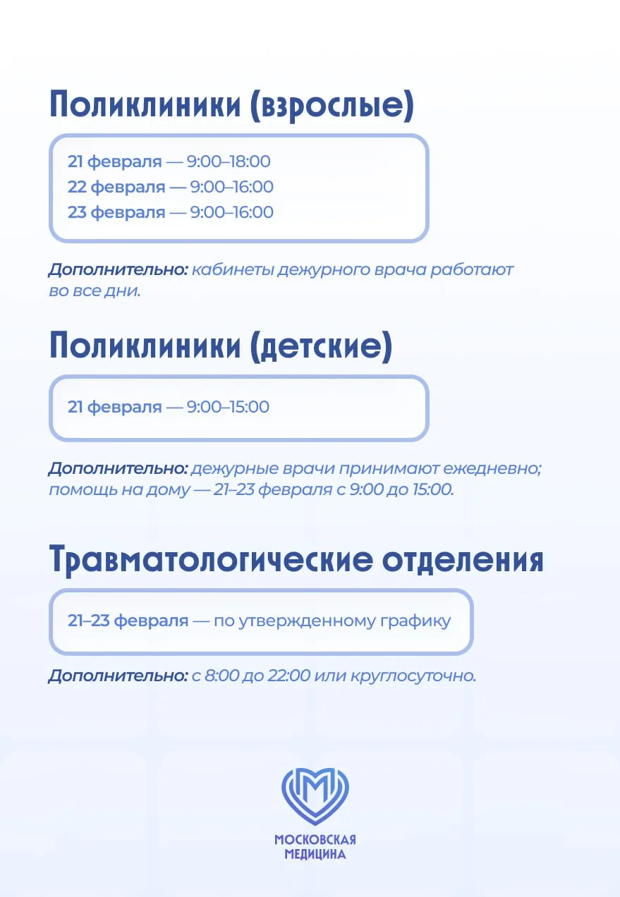 «Мы постарались сделать график работы социальных учреждений в праздничные выходные максимально удобным, чтобы москвичи по-прежнему могли получить необходимую им помощь и поддержку. Поликлиники будут принимать пациентов все три дня, включая 23 февраля, — с сокращенным временем работы, но с обязательным присутствием дежурных врачей», — отметила заммэра Анастасия Ракова.