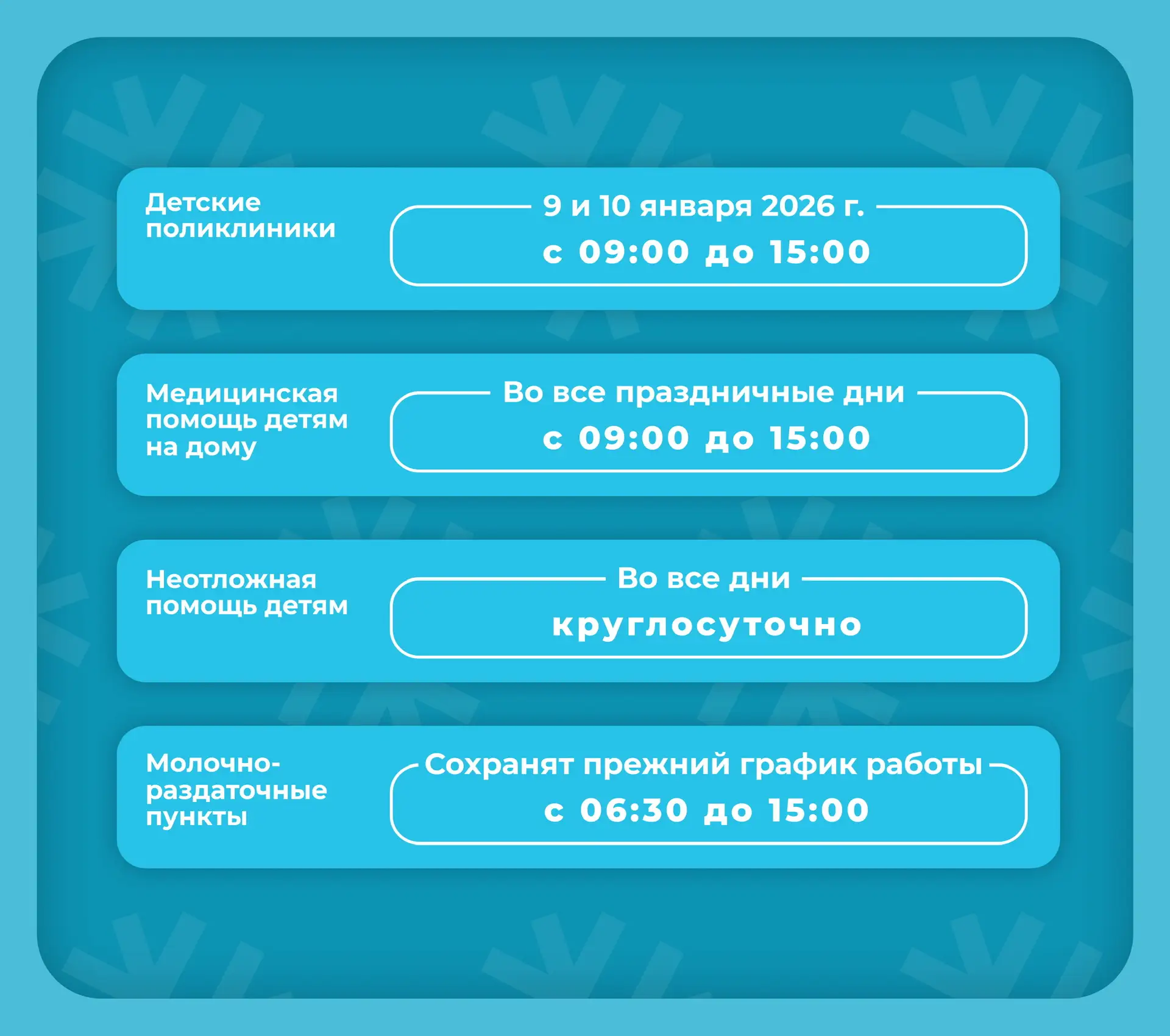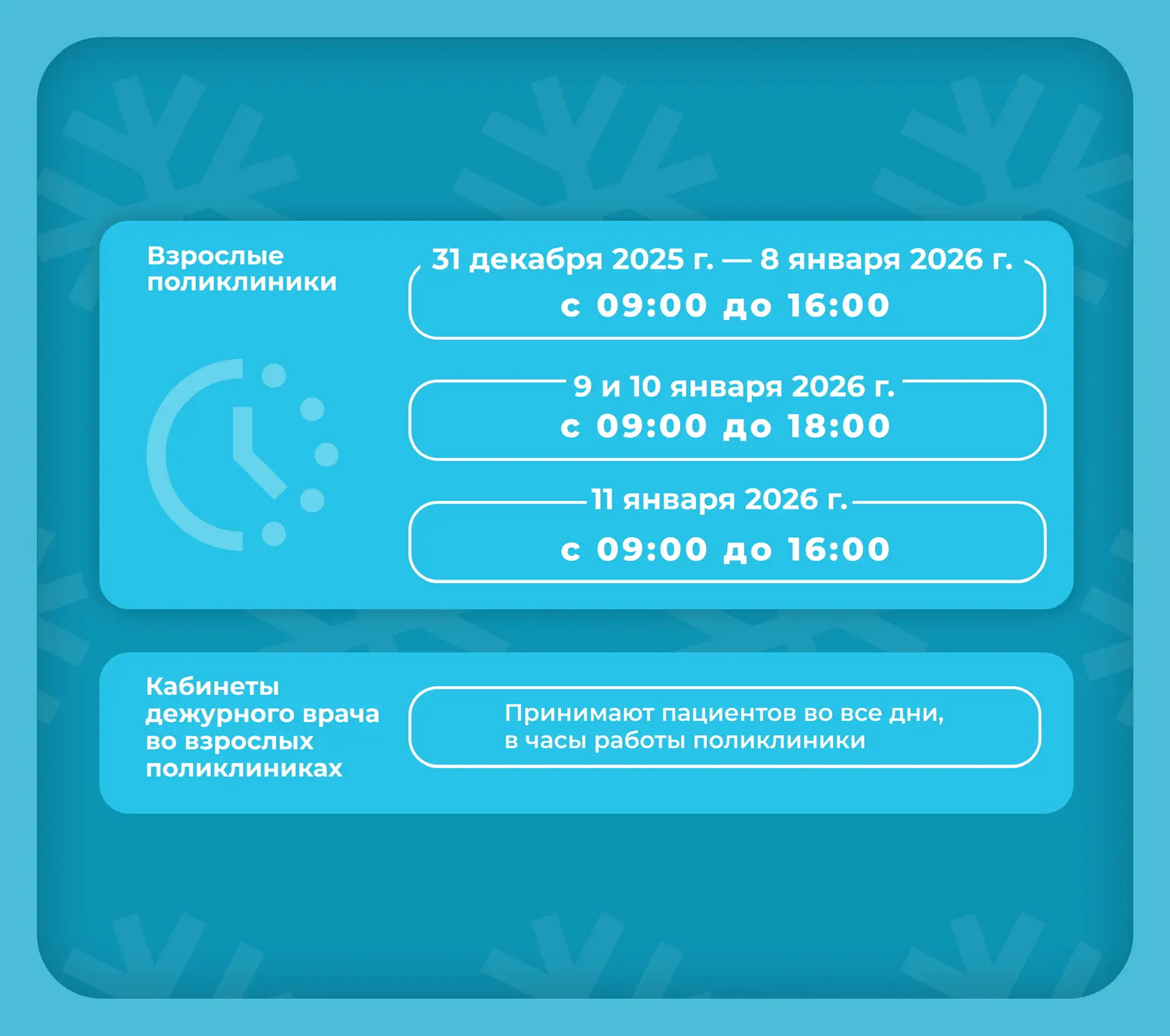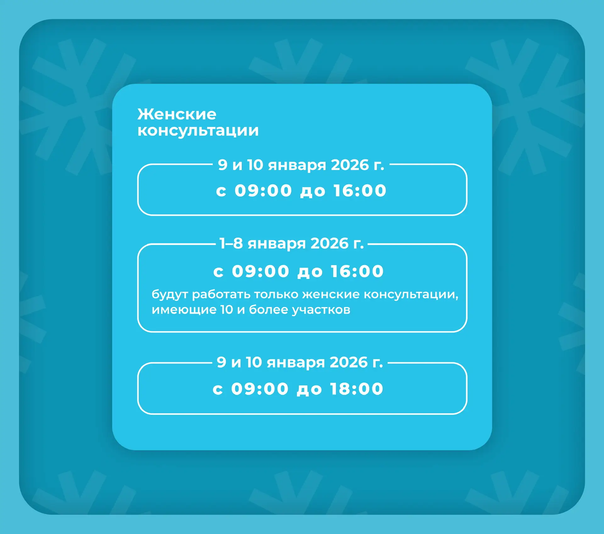 — с 1 по 8 января с 9:00 до 16:00 — только женские консультации, в которых 10 и более участков;