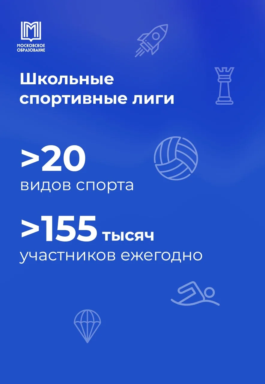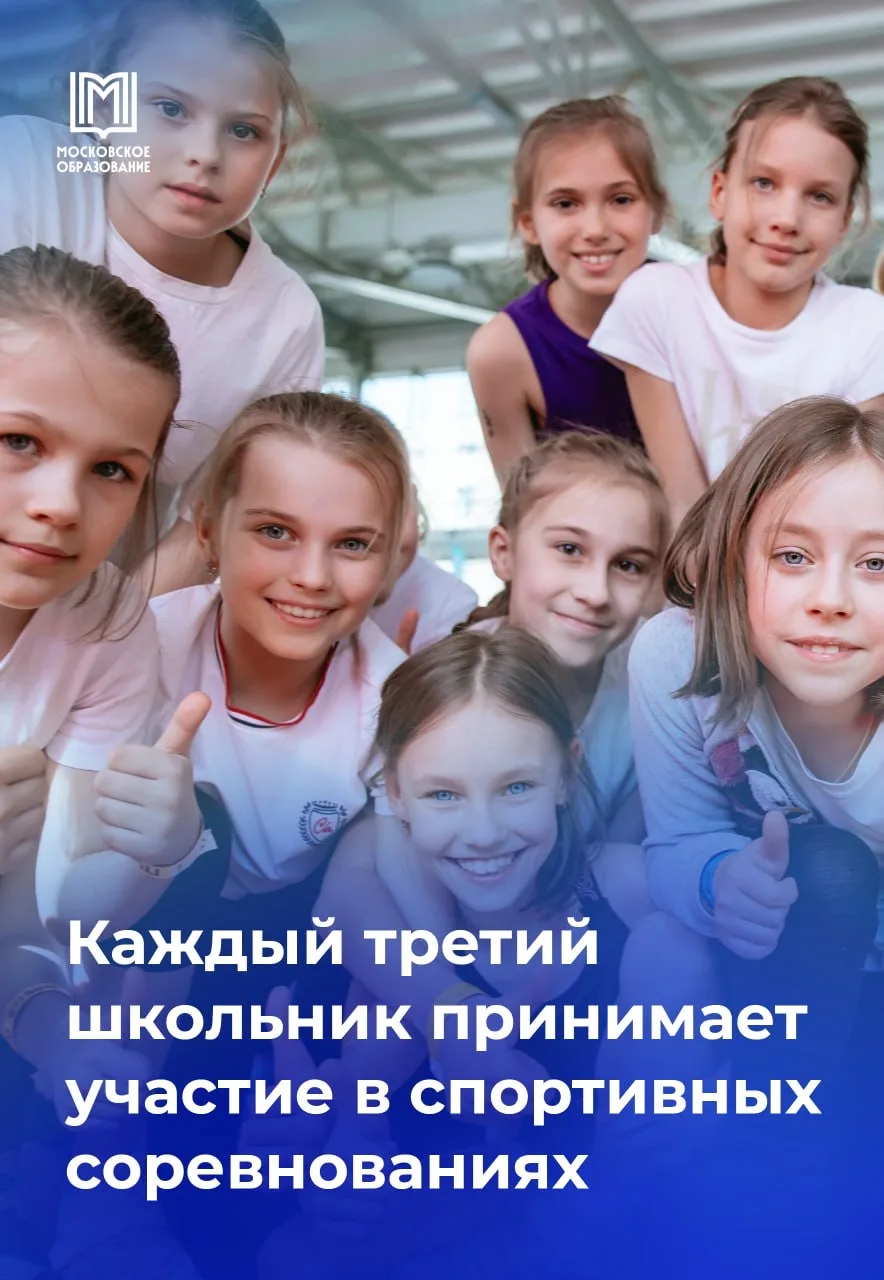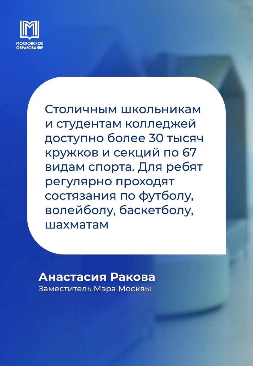 «Набирают популярность такие новые направления, как кибер- и фиджитал-спорт, пляжный волейбол и тэг-регби. За прошлый учебный год в городских турнирах и конкурсах принял участие каждый третий юный житель столицы. Кроме того, за последние три года число участников городских турниров и соревнований выросло в два раза и превысило 500 тысяч человек», — рассказала заммэра Анастасия Ракова.