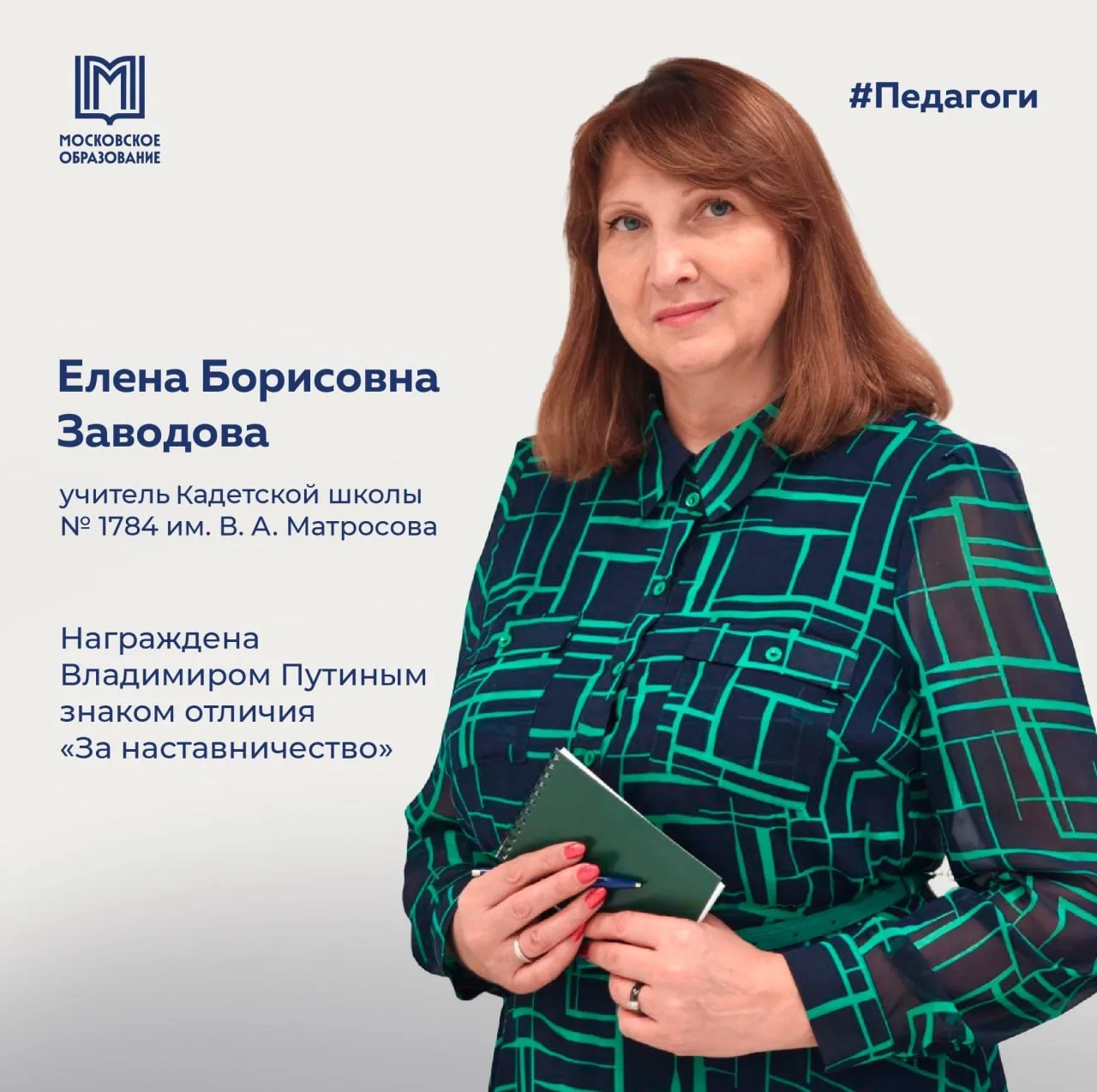 Знак отличия получила Елена Заводова, учитель химии и биологии Кадетской школы № 1784 имени В. А. Матросова, наставник и педагог участника СВО, старшего офицера Романа Гришина.