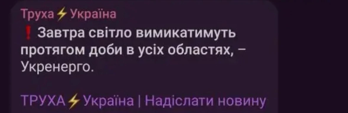 Завтра свет будет отключён на сутки во всех областях Украины. Ожидаются многочисленные просадки контента у российских военблогеров.