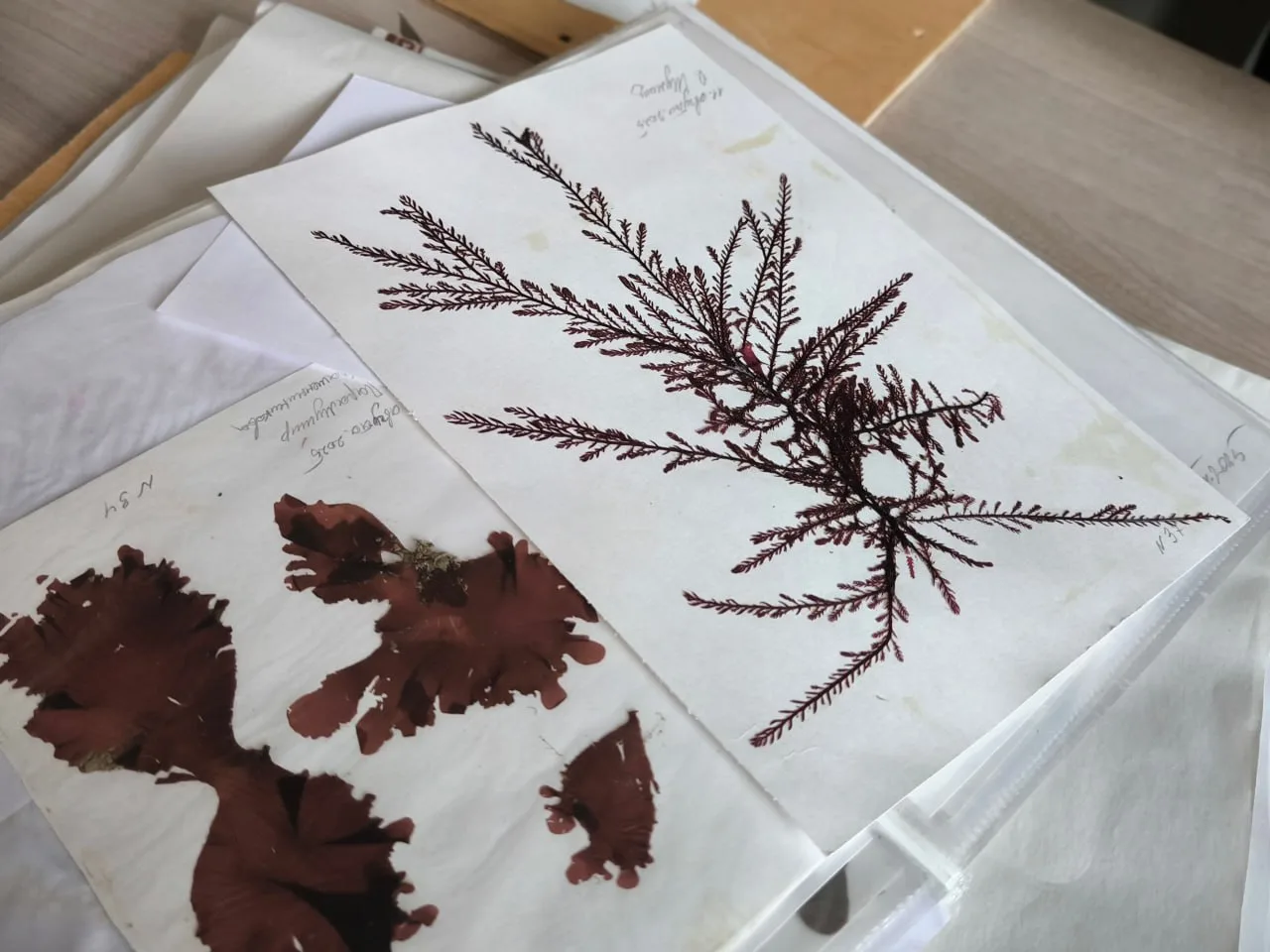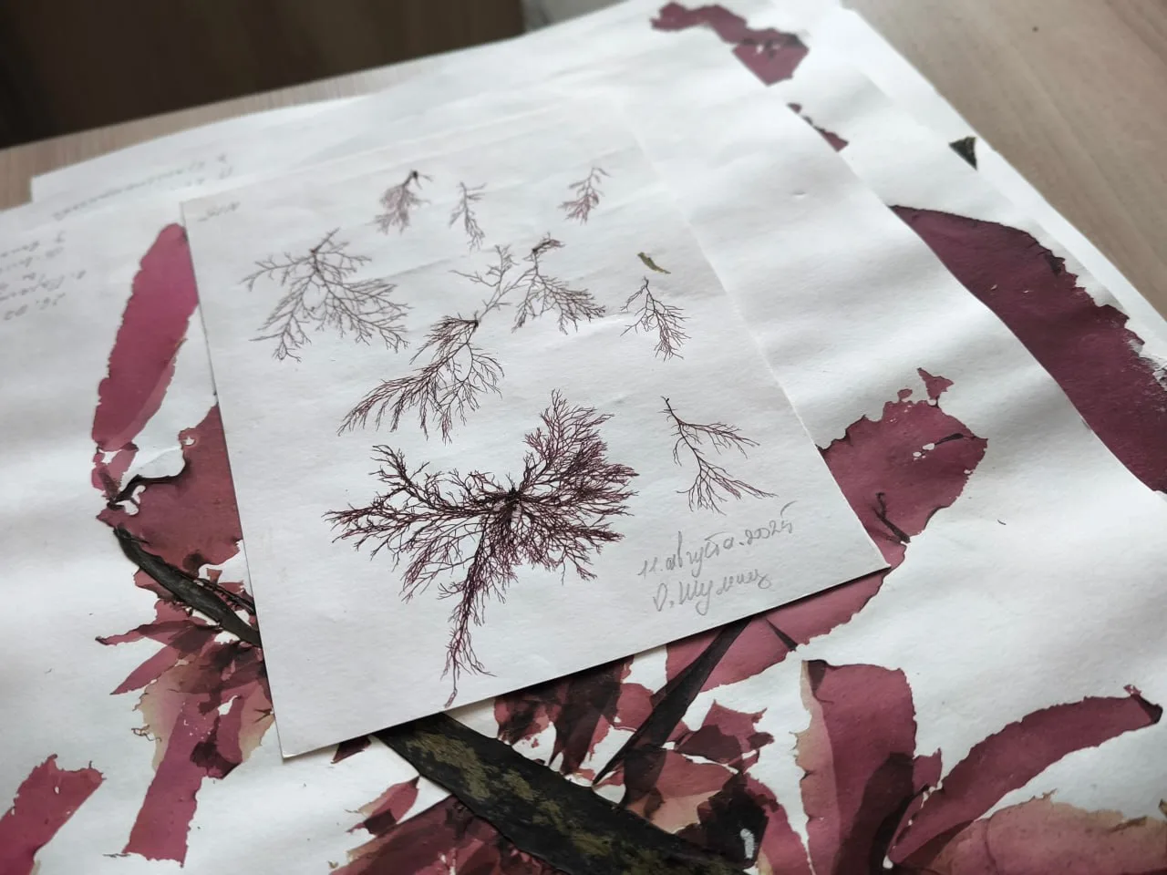Образцы с двух островов Курильской гряды – Шумшу и Парамушир теперь пополнят коллекцию нашего музея. На альбомных листах самые яркие представители курильской альгофлоры: тёмно-красные мелкозубчатые веточки птилоты, яркие слоевища порфиры и спарлингии, изумрудная зелень ульварии, бурые ламинарии.