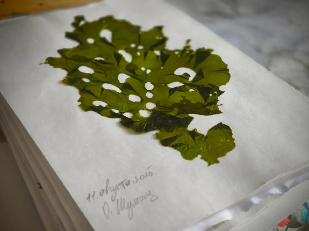 Сделать такой водорослевый гербарий непросто, особенно в полевых условиях. Для этого нужно собранные водоросли расправить в воде, аккуратно расположить на монтажном листе бумаги, а потом проложить промокательной бумагой или марлей и поместить под пресс для высушивания.