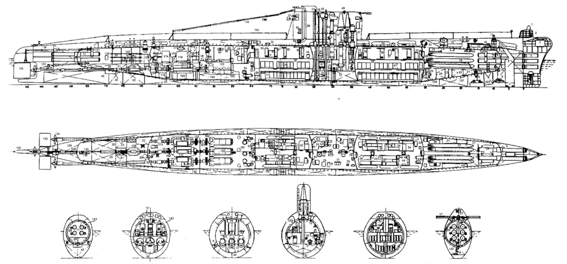 ✔️7 кормовой и жилой отсек – в котором находятся 4 кормовых торпедных аппарата, система стрельбы ГС-100, гирокомпас, пост аварийного управления кормовым и носовым горизонтальными рулями и вертикальным рулём, люк для аварийного выхода и спальные места для личного состава.
