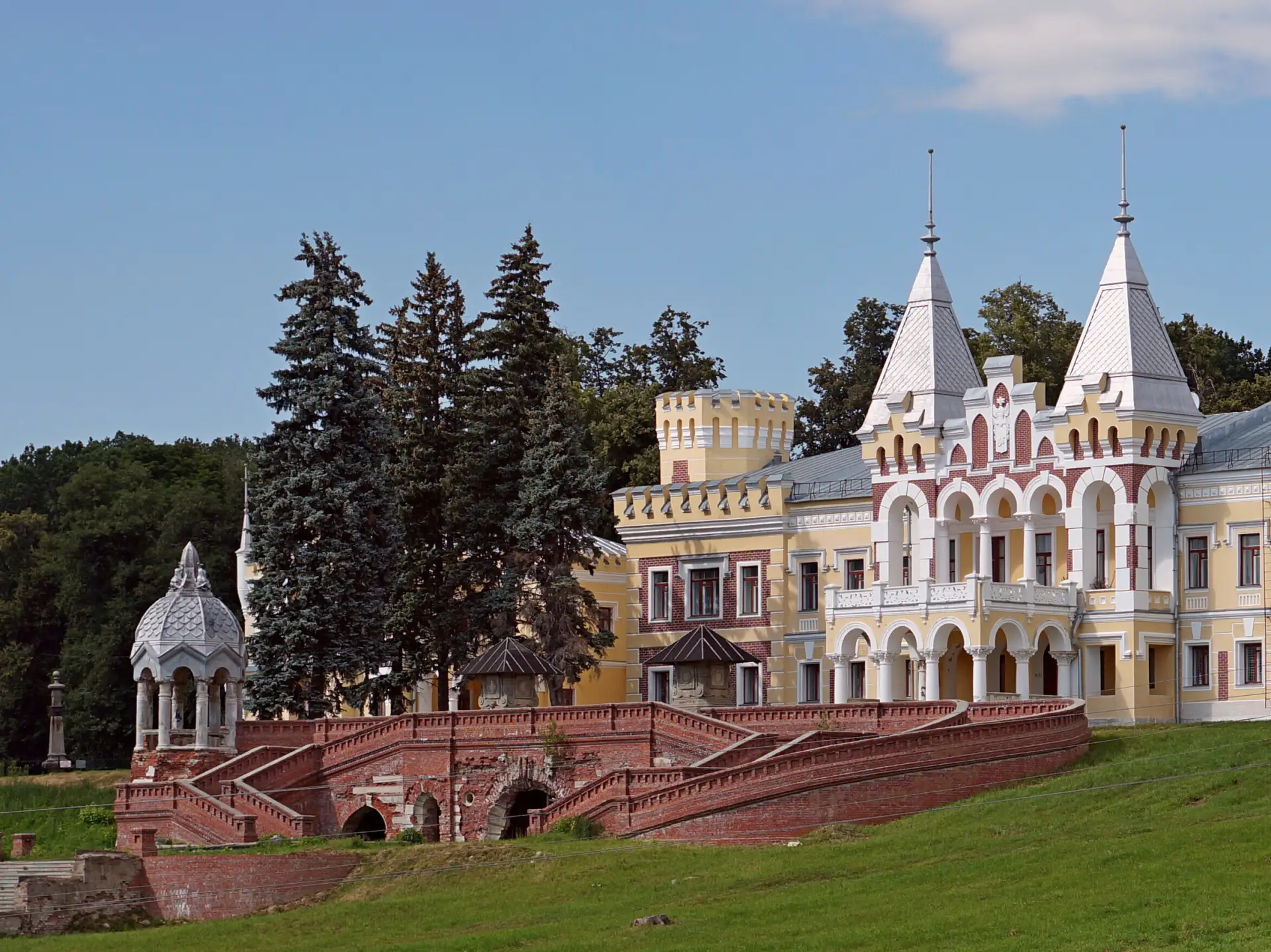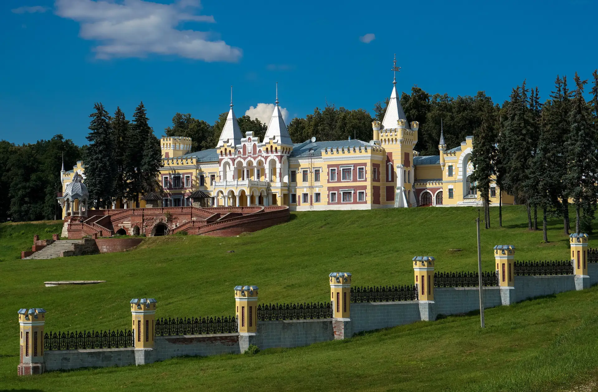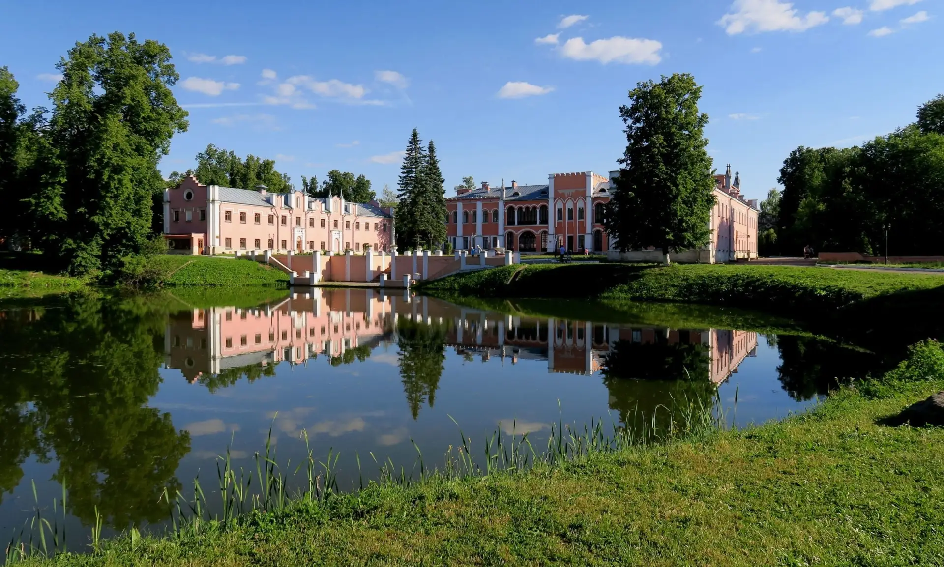 Усадьба Марфино. Одна из самых необычных усадеб Московской области. Нежно-розовый дворец в средневековом стиле, фигуры грифонов у пруда, большой парк с ручьями и беседками, готический мост.