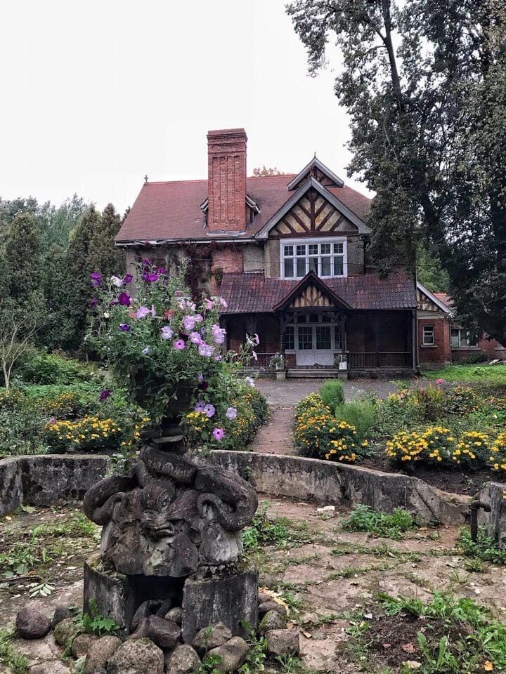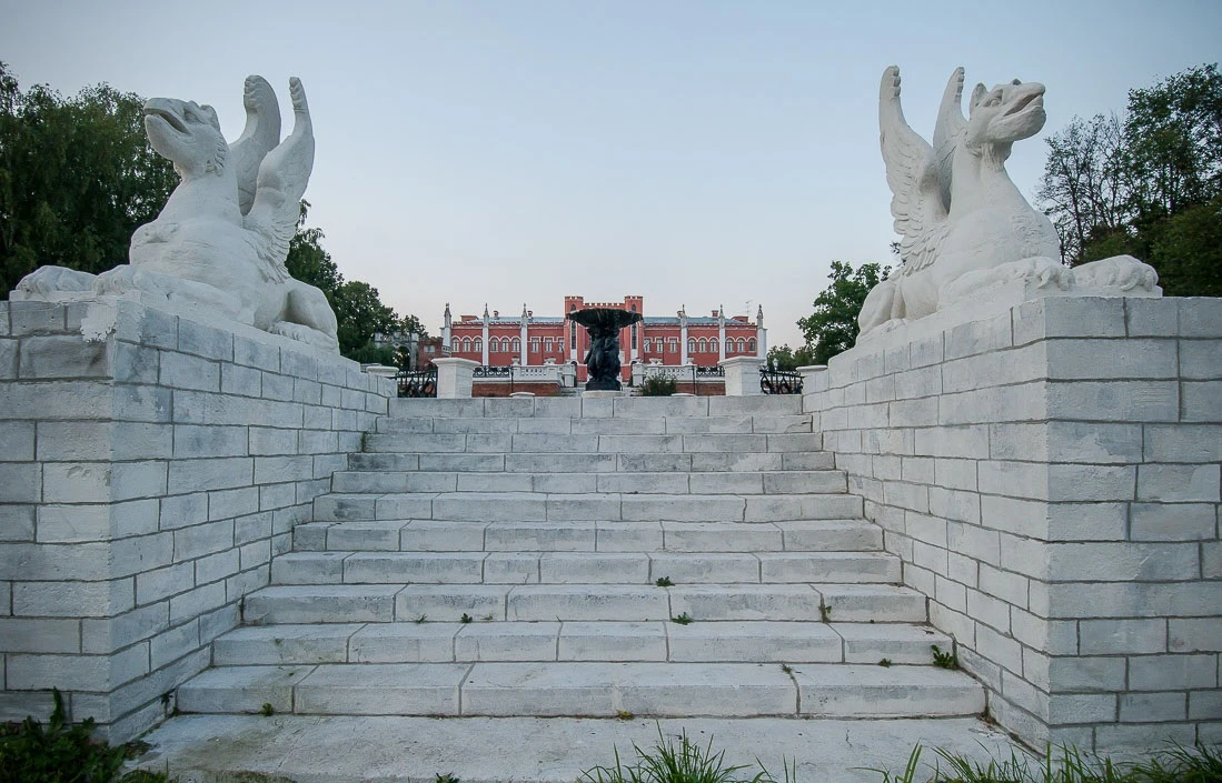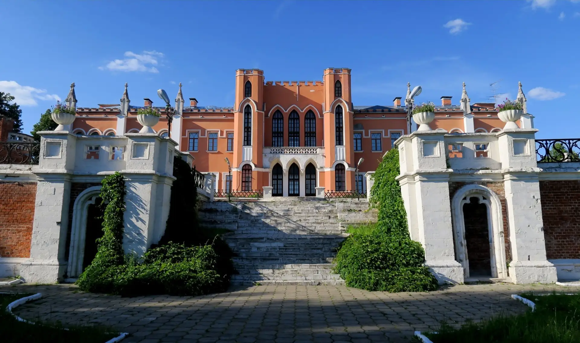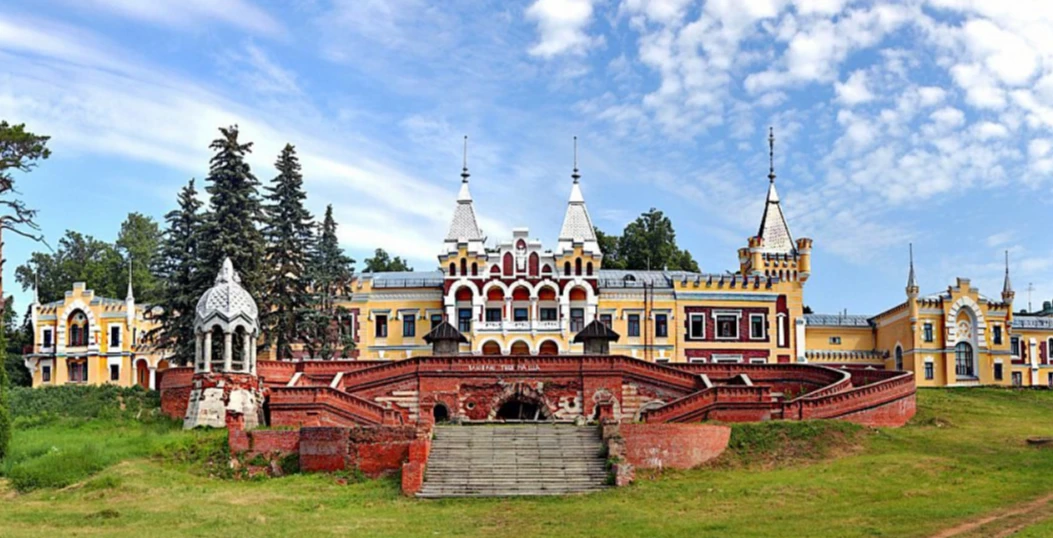Усадьба Марфино. Одна из самых необычных усадеб Московской области. Нежно-розовый дворец в средневековом стиле, фигуры грифонов у пруда, большой парк с ручьями и беседками, готический мост.
