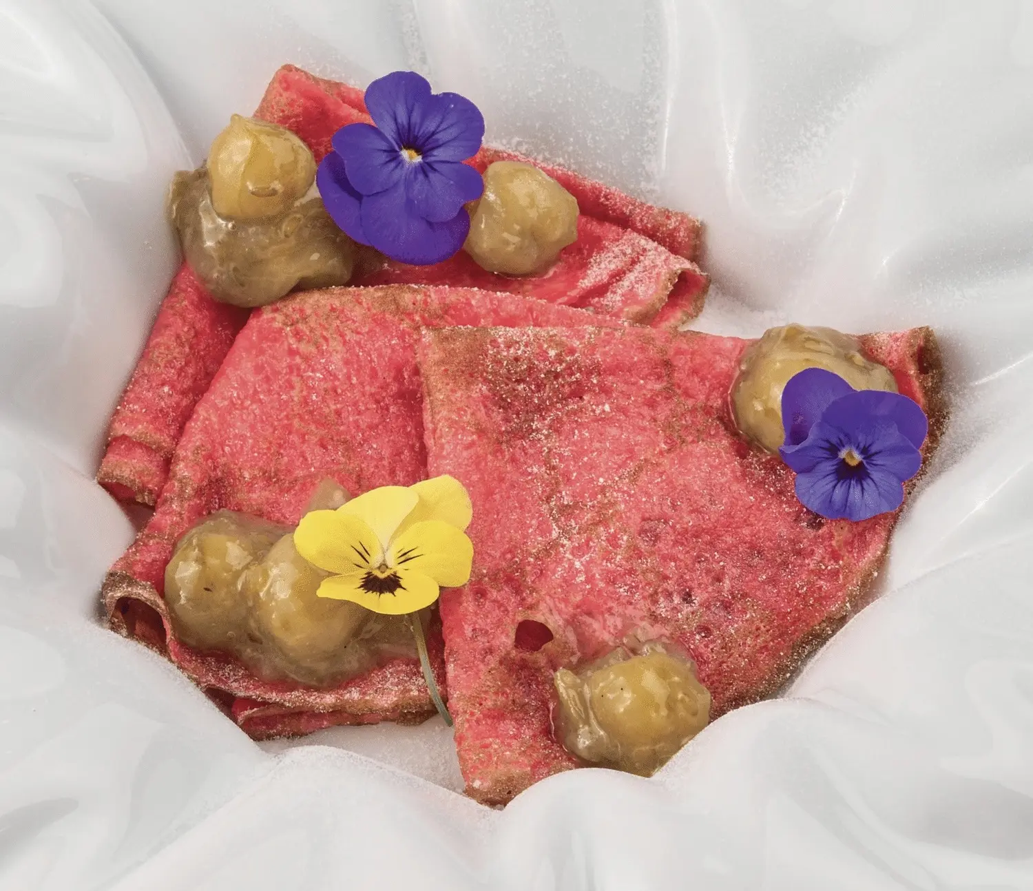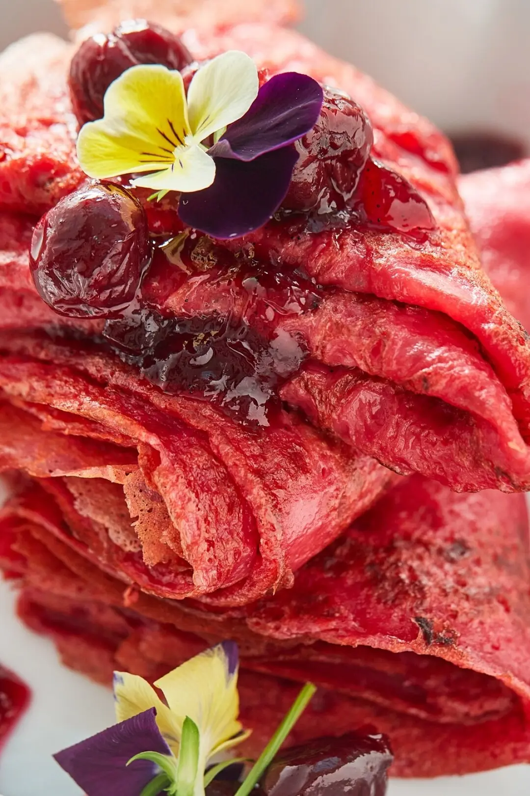 Сегодня шефы подкрашивают блины не только свекольным соком, но и порошком питахайи (розовой матчей), а подают с крыжовенным вареньем или джемом из морошки.