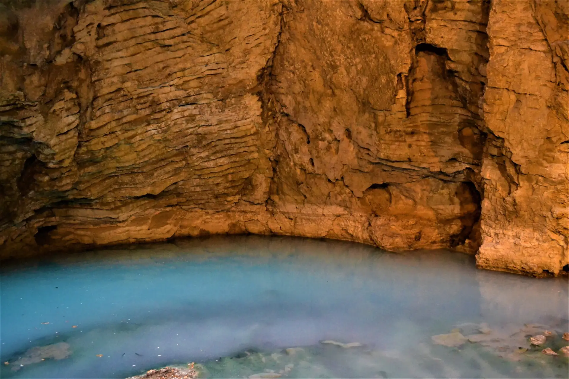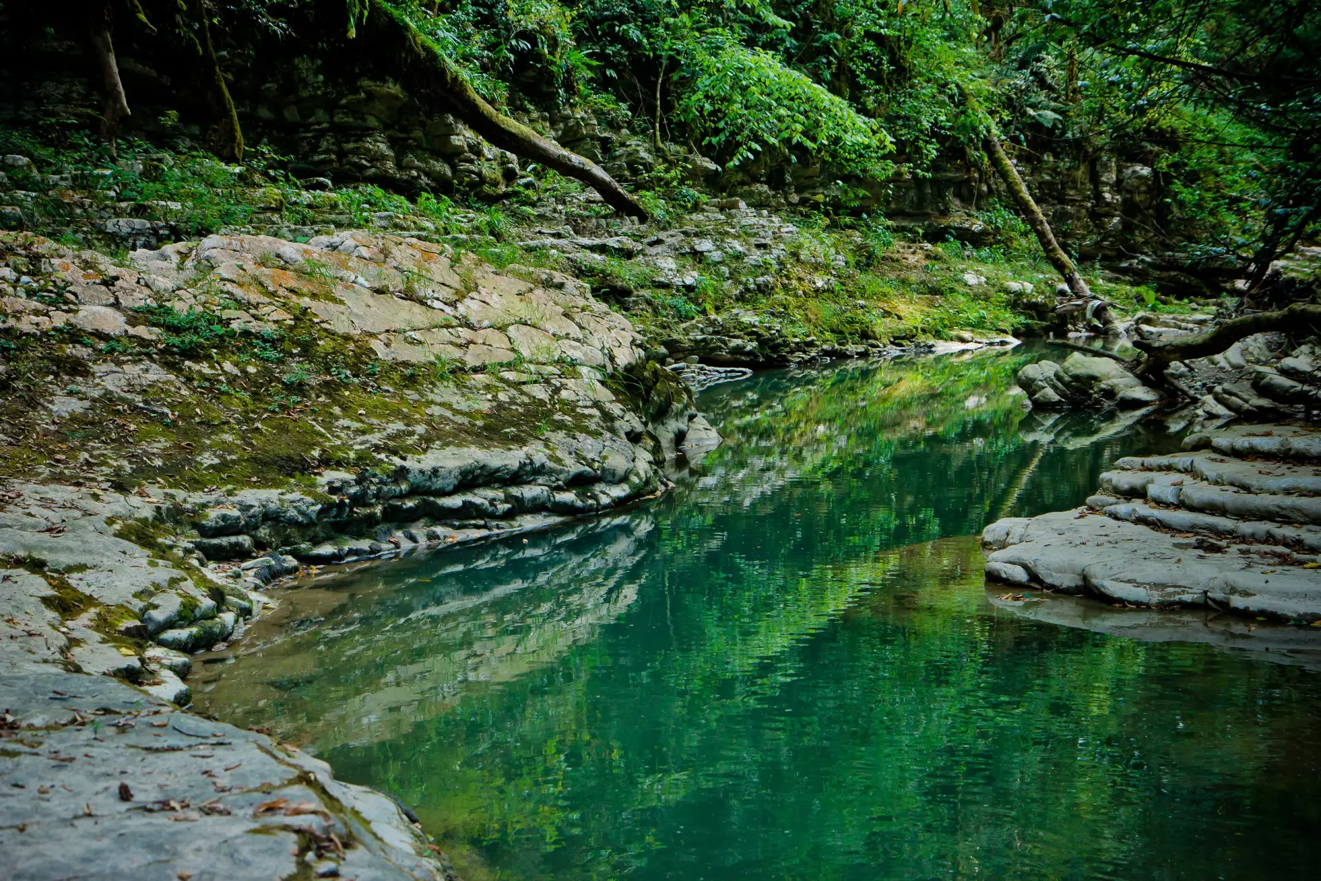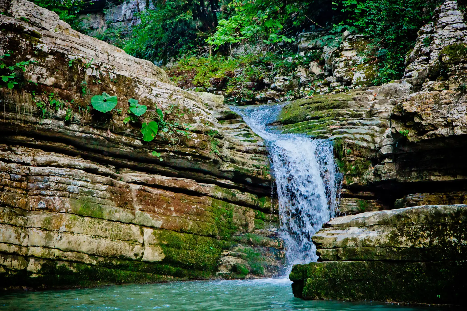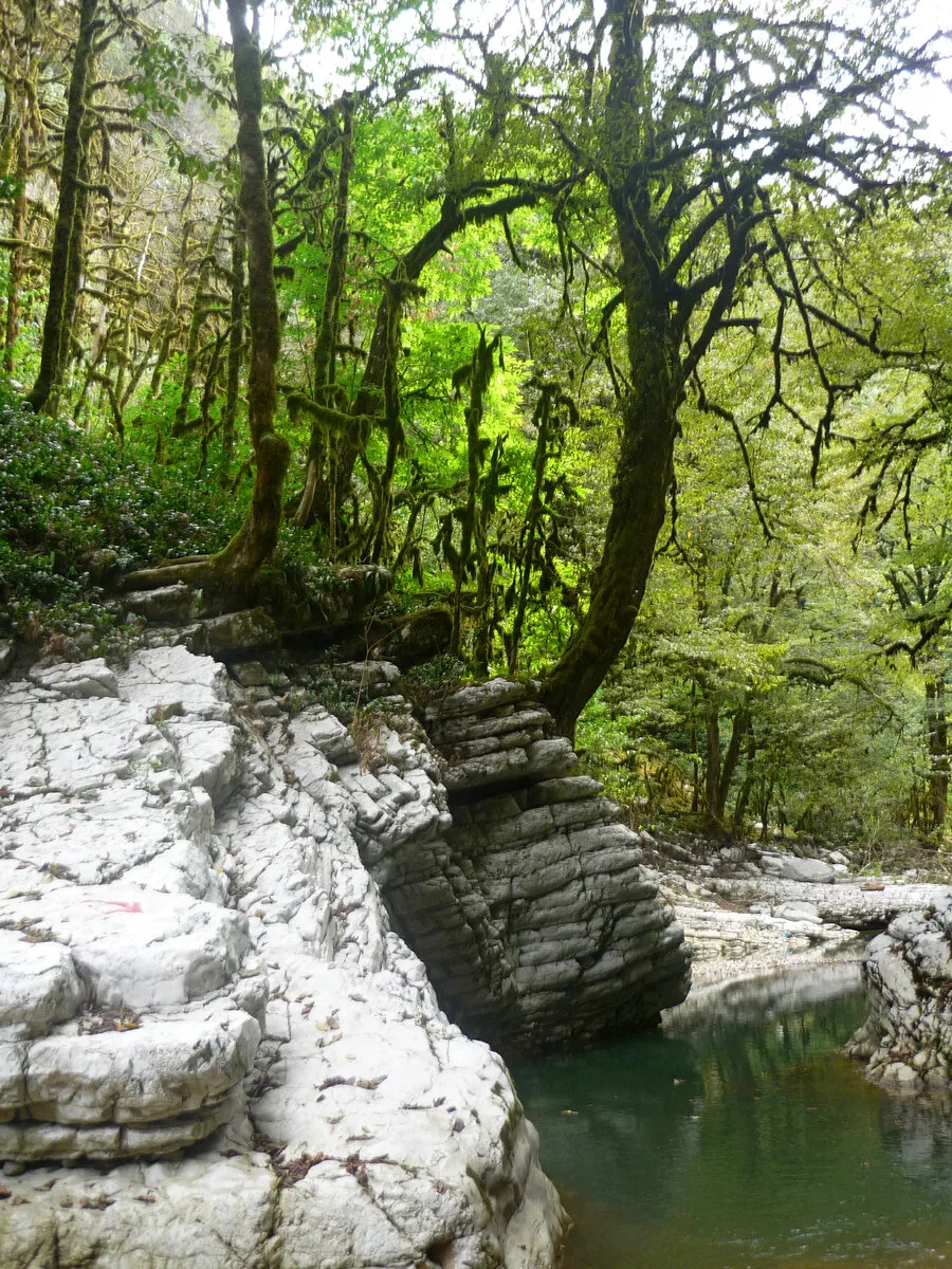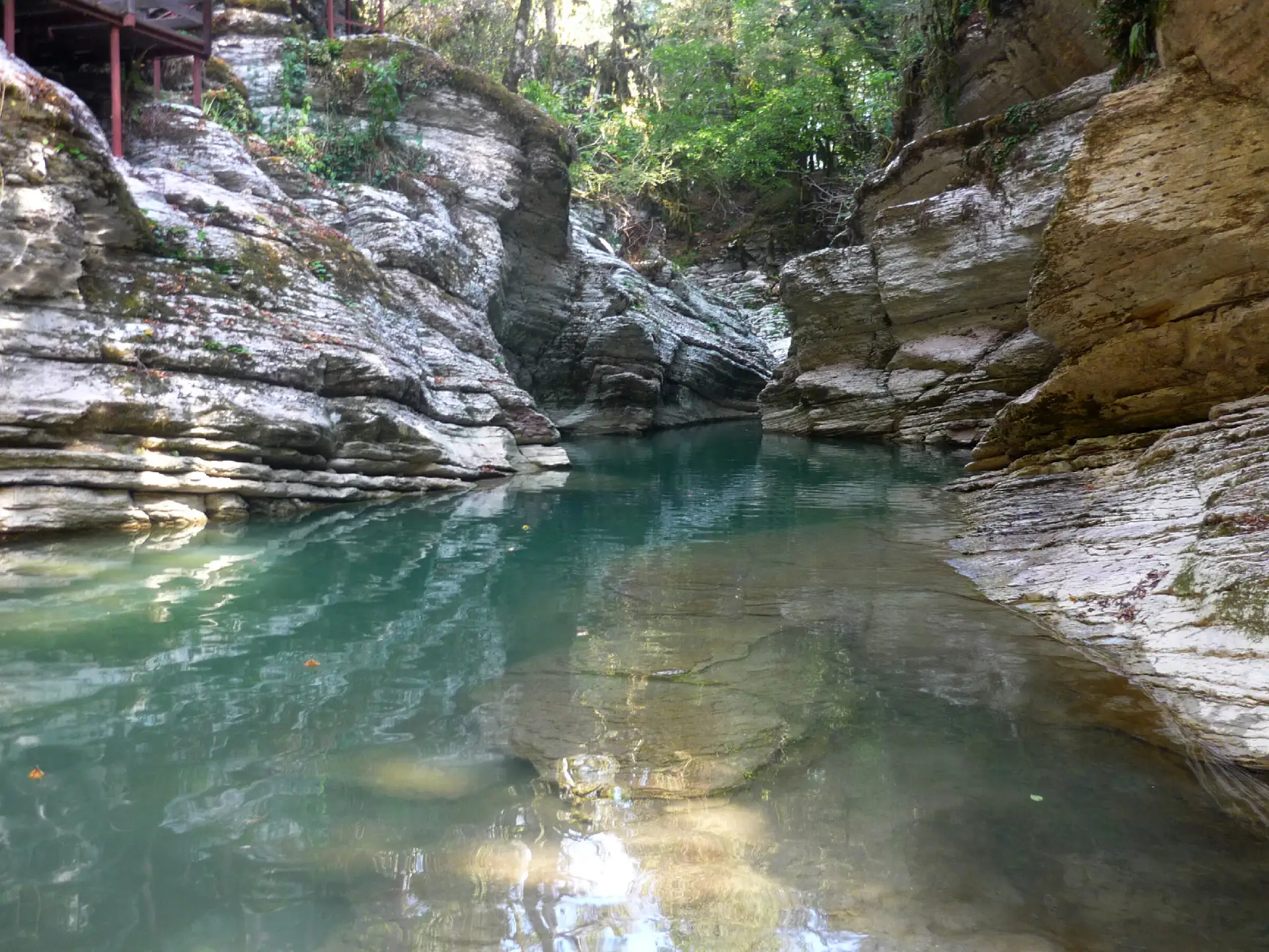 Ущелье горной реки Псахо (каньон) делят на Мокрый и Сухой. В первом течет одноименная река, а во втором – старое ее русло. В той части ущелья, где по дну разливается чистейшая голубая вода, туристы могут видеть водоскаты, небольшие водопады и карстовые купели.