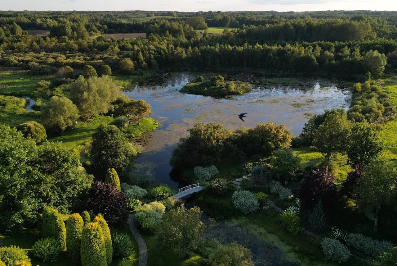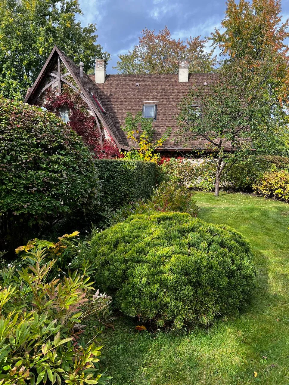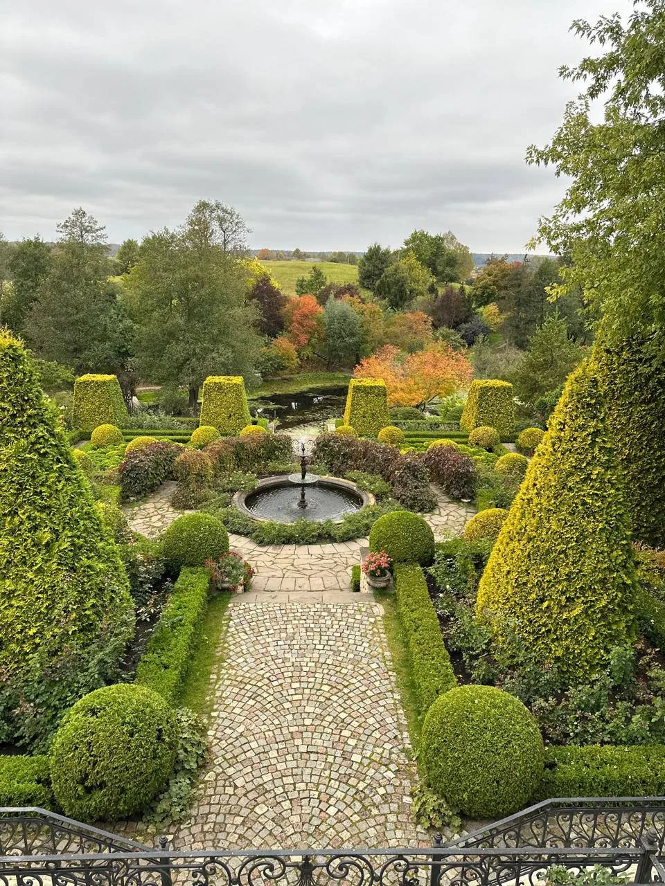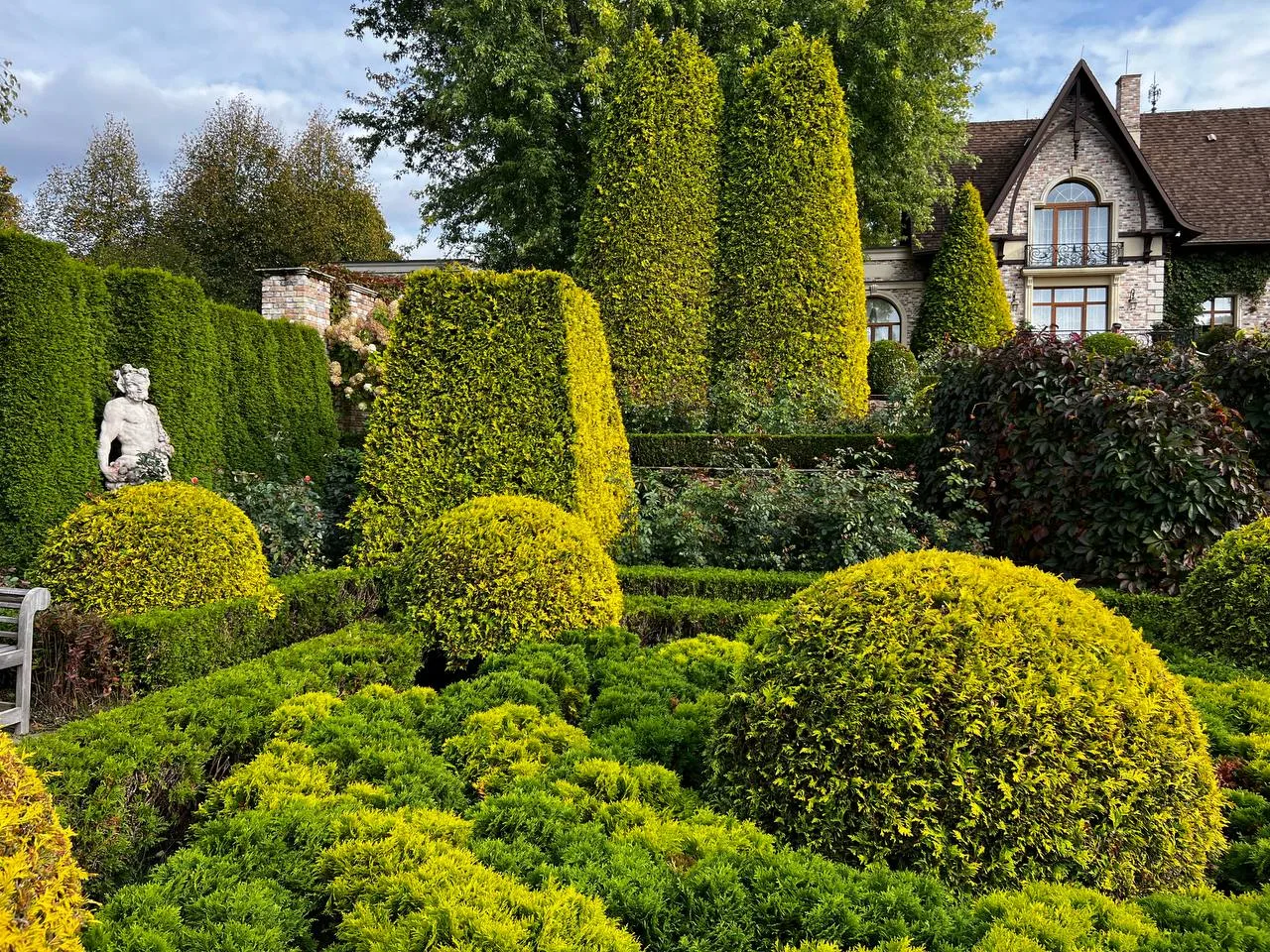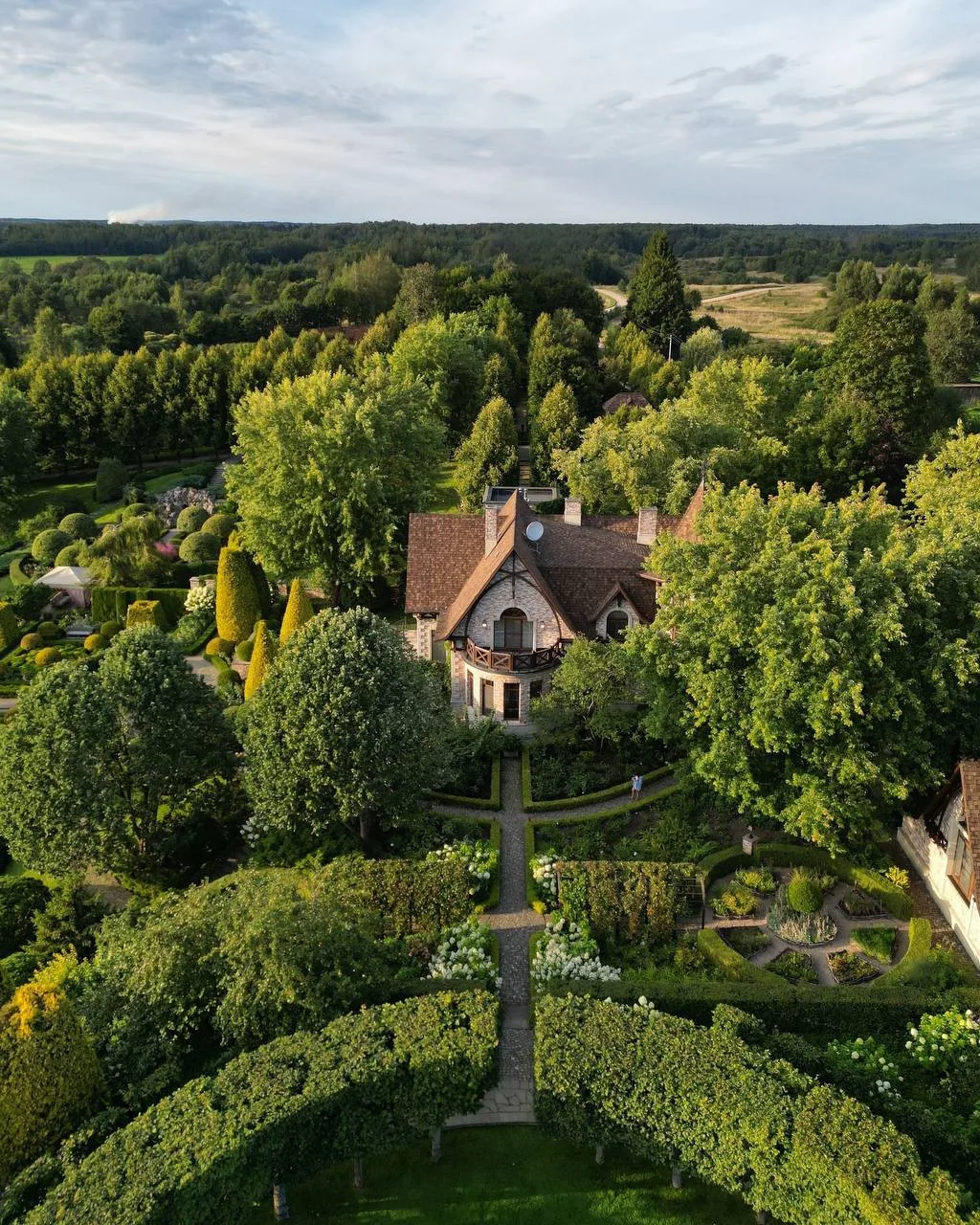 Центральная точка сада отмечена усадебным домом — маленьким замком в нормандском стиле. С одной стороны замок окружает итальянский сад, где на лужайке, засеянной ландышами, крокусами и подснежниками, каменный Амур сгибает лук.
