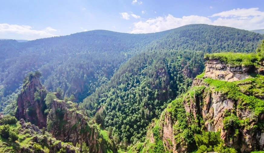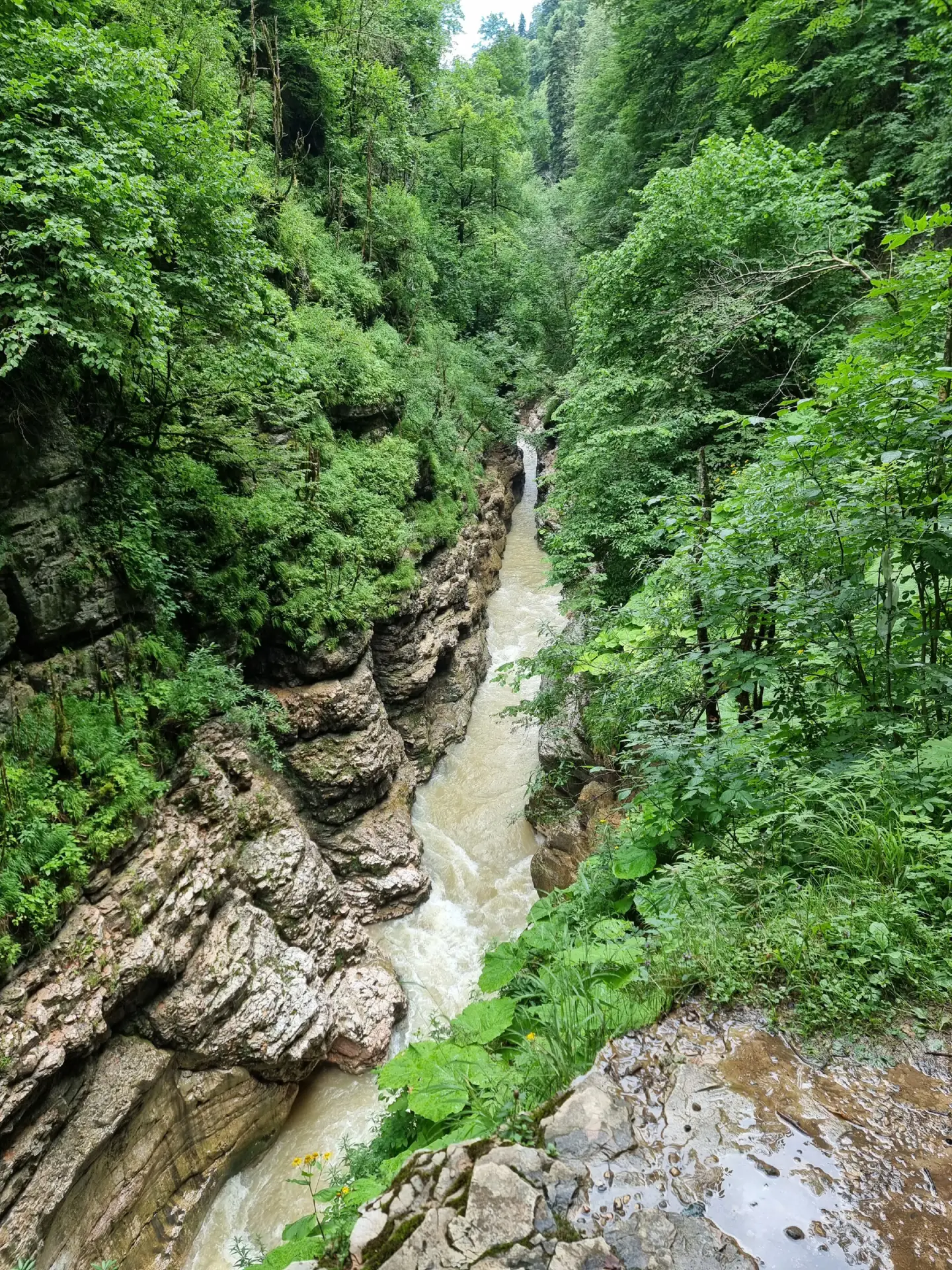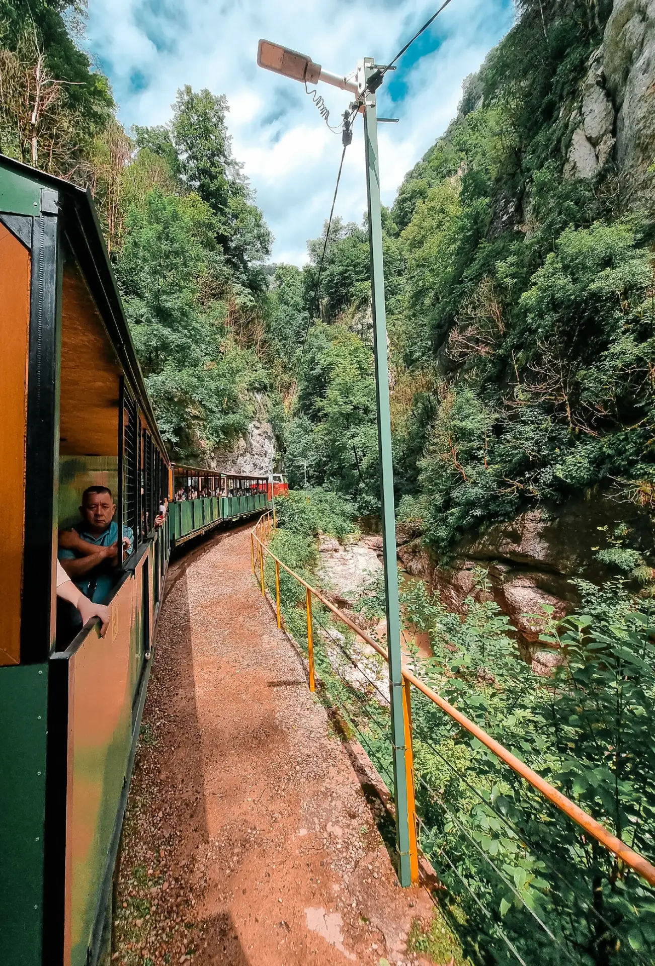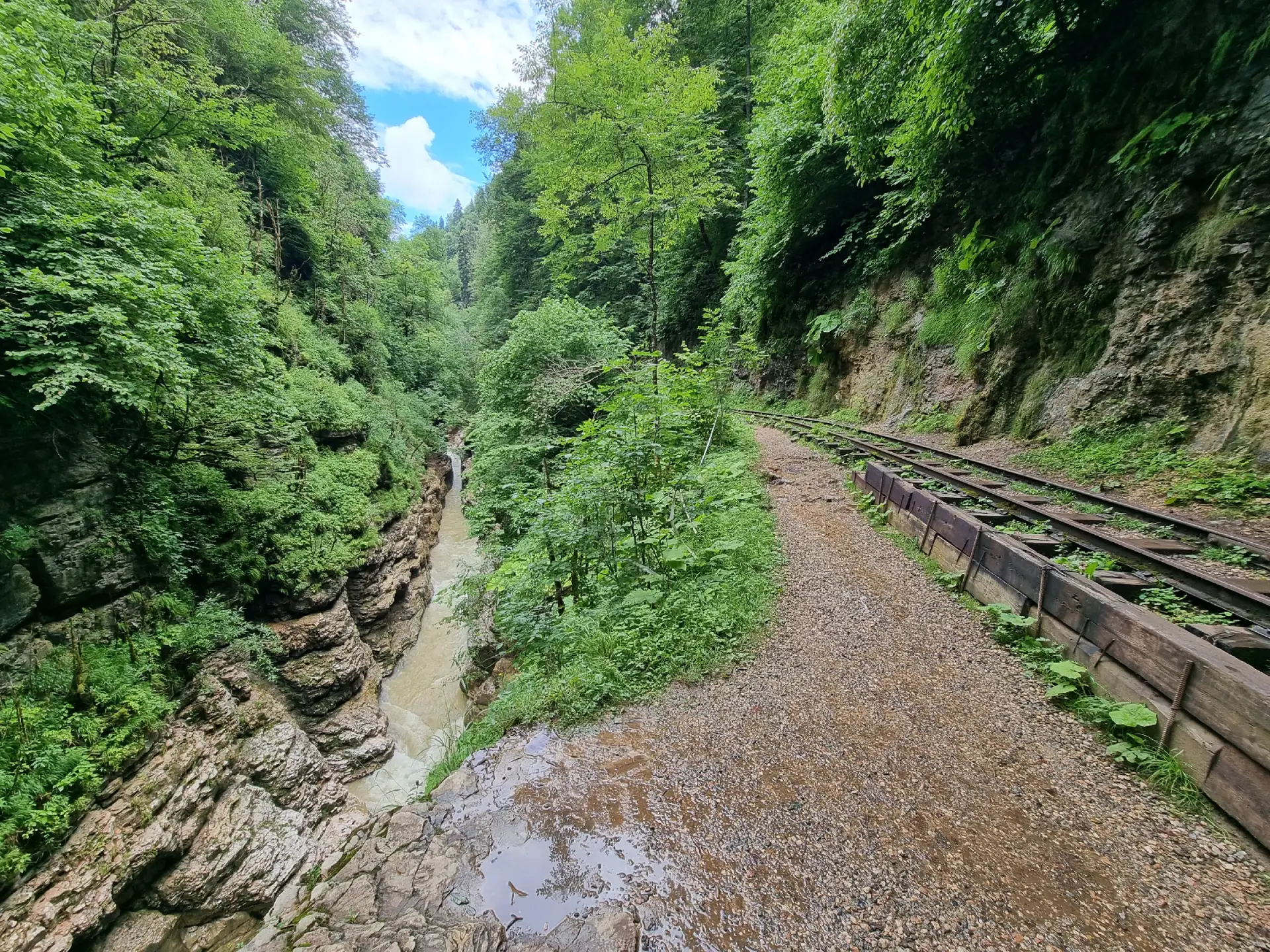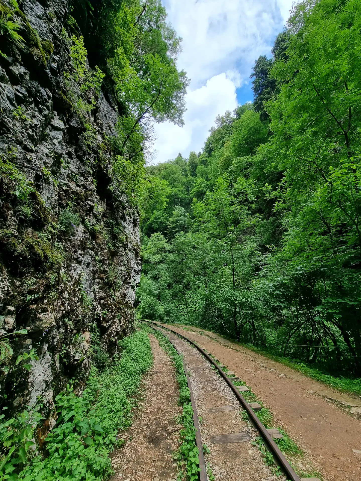 Это живописная, глубокая и очень узкая теснина с узкоколейной железной дорогой, проложенной по самой кромке обрыва.