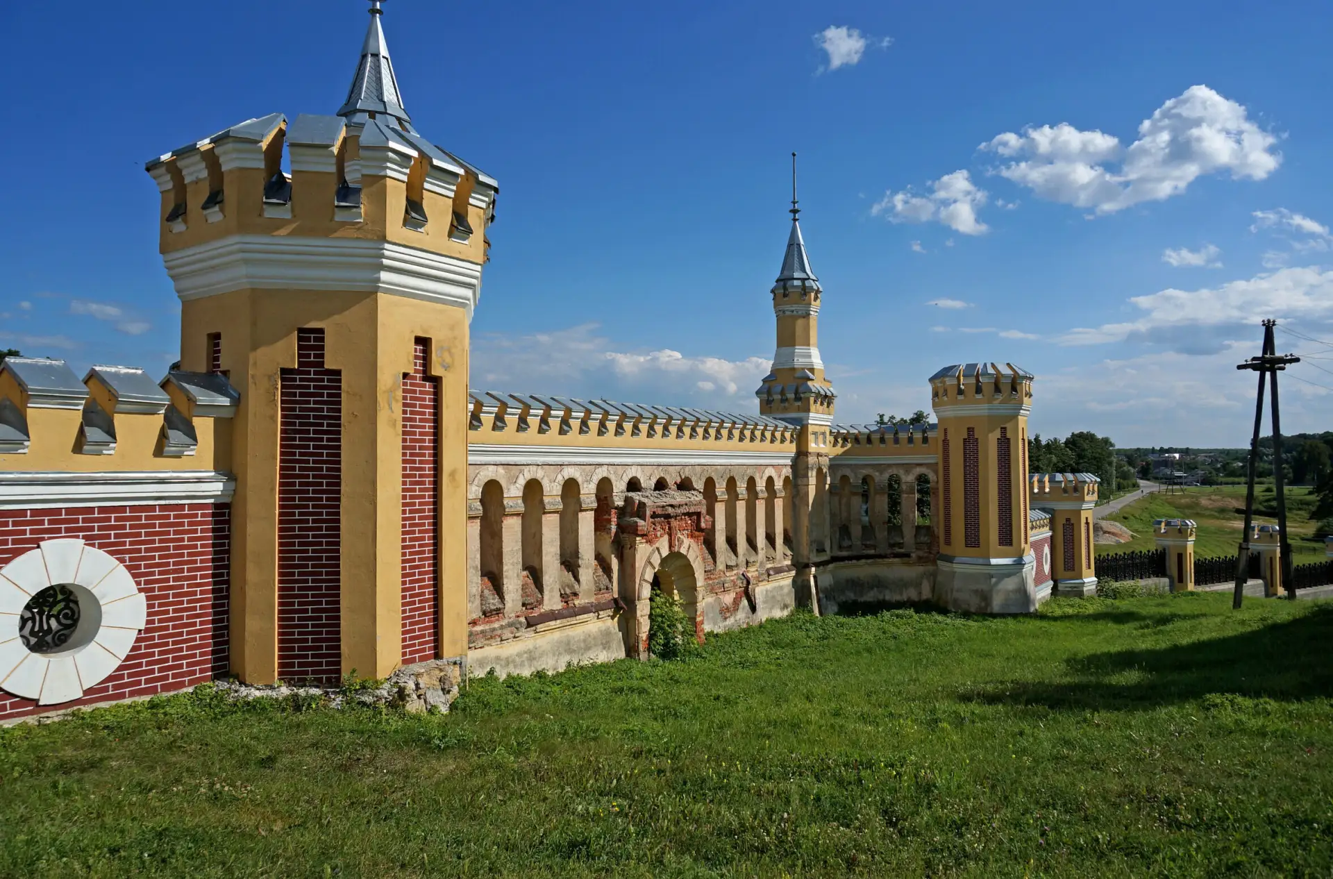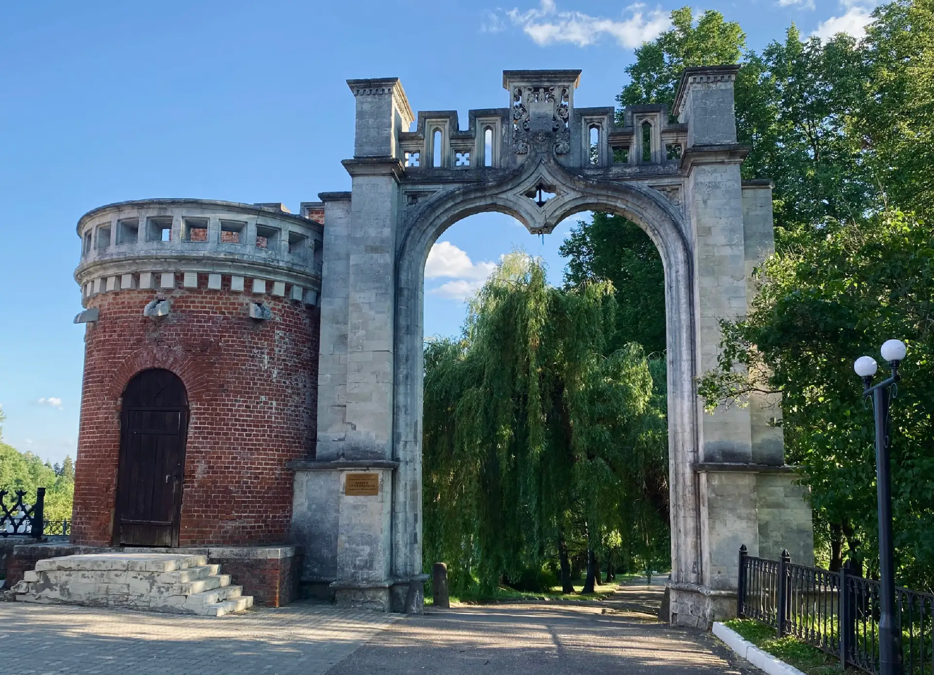 Прогулку по усадьбе лучше начать с въездных ворот с южной стороны. Дорога проходит под резной готической аркой.