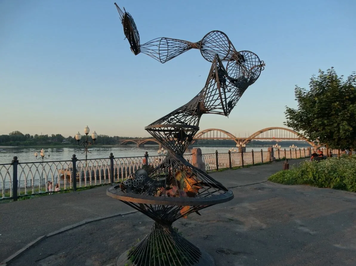 С набережной видна синяя лента Волги и Заволжский район города, лежащий с другой стороны Волжского моста.
