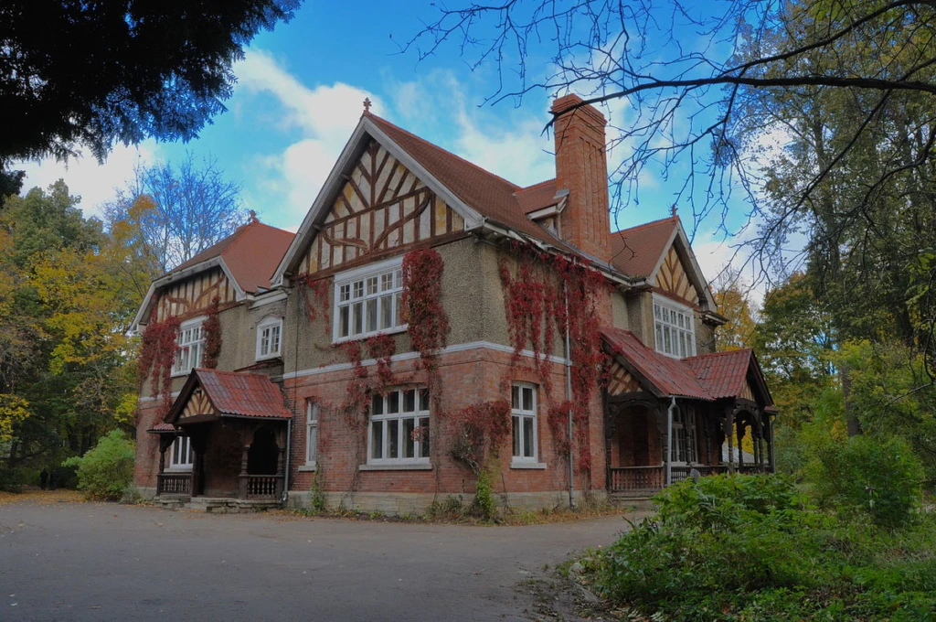 Дача великого князя Бориса Владимировича Романова (Московское шоссе, 3, Пушкин) представляет собой несколько домов в стиле Тюдоров – подражание английским крестьянским усадьбам XVI века.