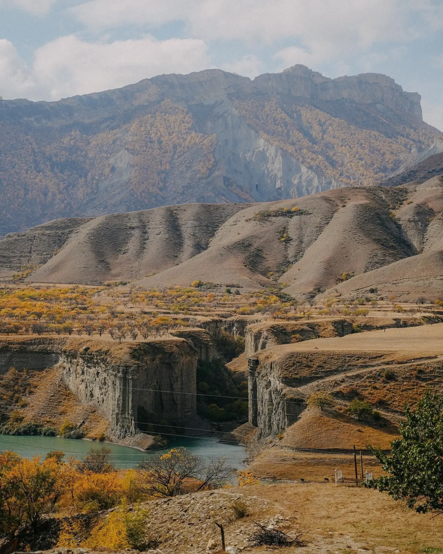 Гуниб лежит на этой природной неприступной крепости с отвесными обрывами на высоте 1500 метров. Поэтому его еще называют селом, парящим в небесах.