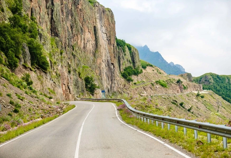 С дороги открываются захватывающие дух панорамы на Эльбрус, горные хребты, ущелья и реки. Дорога представляет собой узкий горный серпантин с крутыми подъемами, спусками и резкими поворотами.