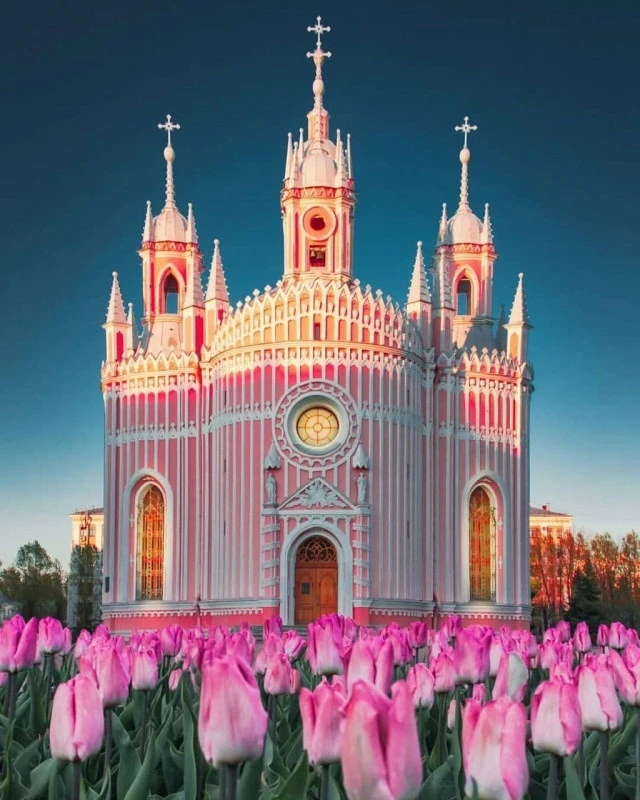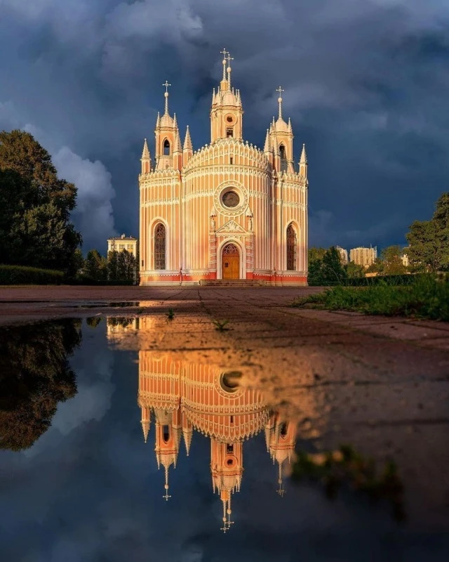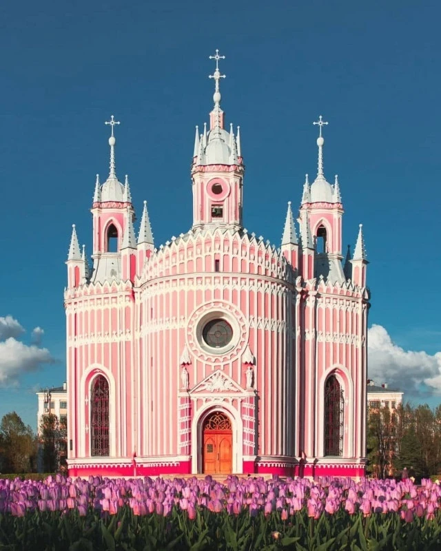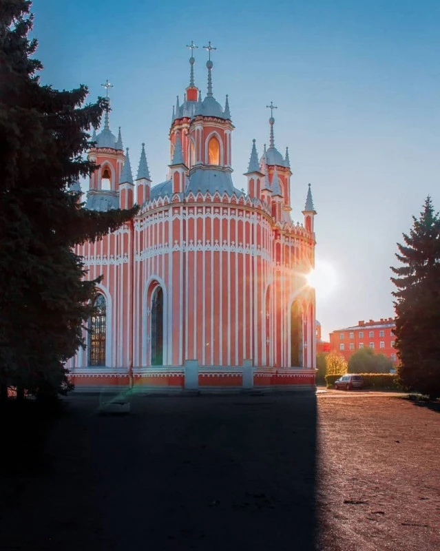Неподалеку от Московского проспекта, среди зданий сталинской эпохи и хрущевок, на небольшой площади перед нашим взором предстает бело-розовое чудо — изящная и легкая церковь в псевдоготическом стиле, с устремленными к небу остроконечными башенками и высокими стрельчатыми окнами.