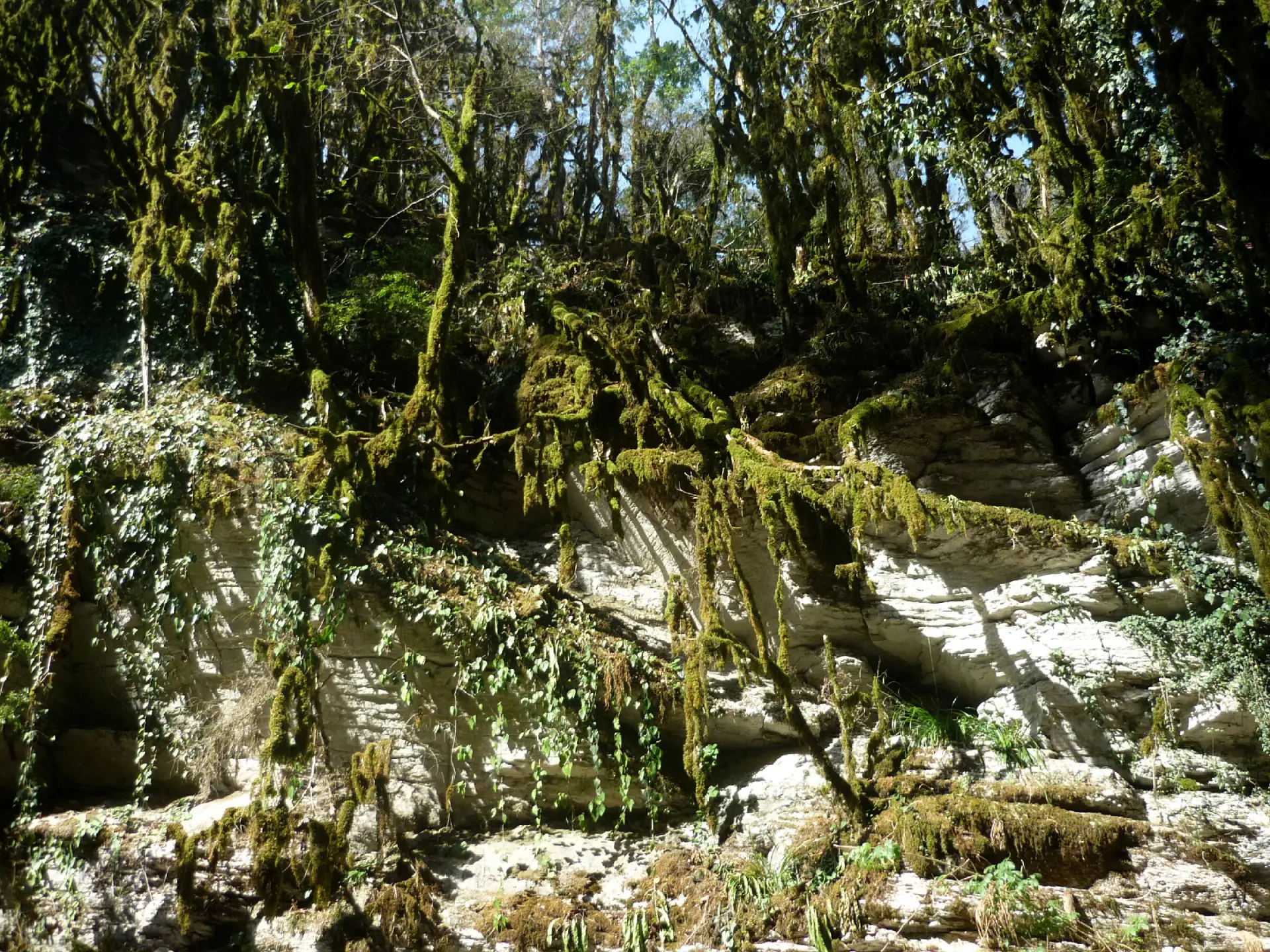 До Сухого каньона несколько километров пути. И находится он на 100 метров выше Мокрого. Без реки Псахо долина выглядит не менее живописно. Узкий проход между 30-метровыми каменными стенами из мягкого песчаника тянется на 200 метров. Красоту месту придает реликтовая зелень.