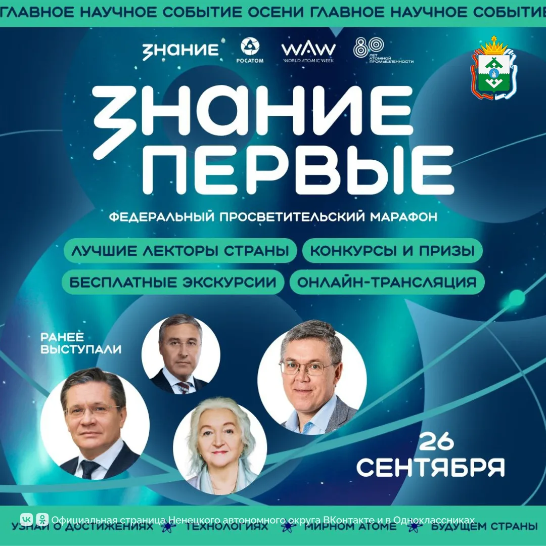 26 сентября в Нарьян-Маре пройдёт федеральный просветительский марафон Знание.Первые, приуроченный к 80-летию атомной промышленности России. Во Дворце культуры «Арктика» со школьниками и студентами встретятся известные государственные и общественные деятели, военные корреспонденты, разработчики новых технологий, спортсмены, представители бизнеса и медиасферы. В центре внимания участников – достижения атомной отрасли и её влияние на будущее страны. Организатор марафона – Общество «Знание» при поддержке ГК «Росатом».