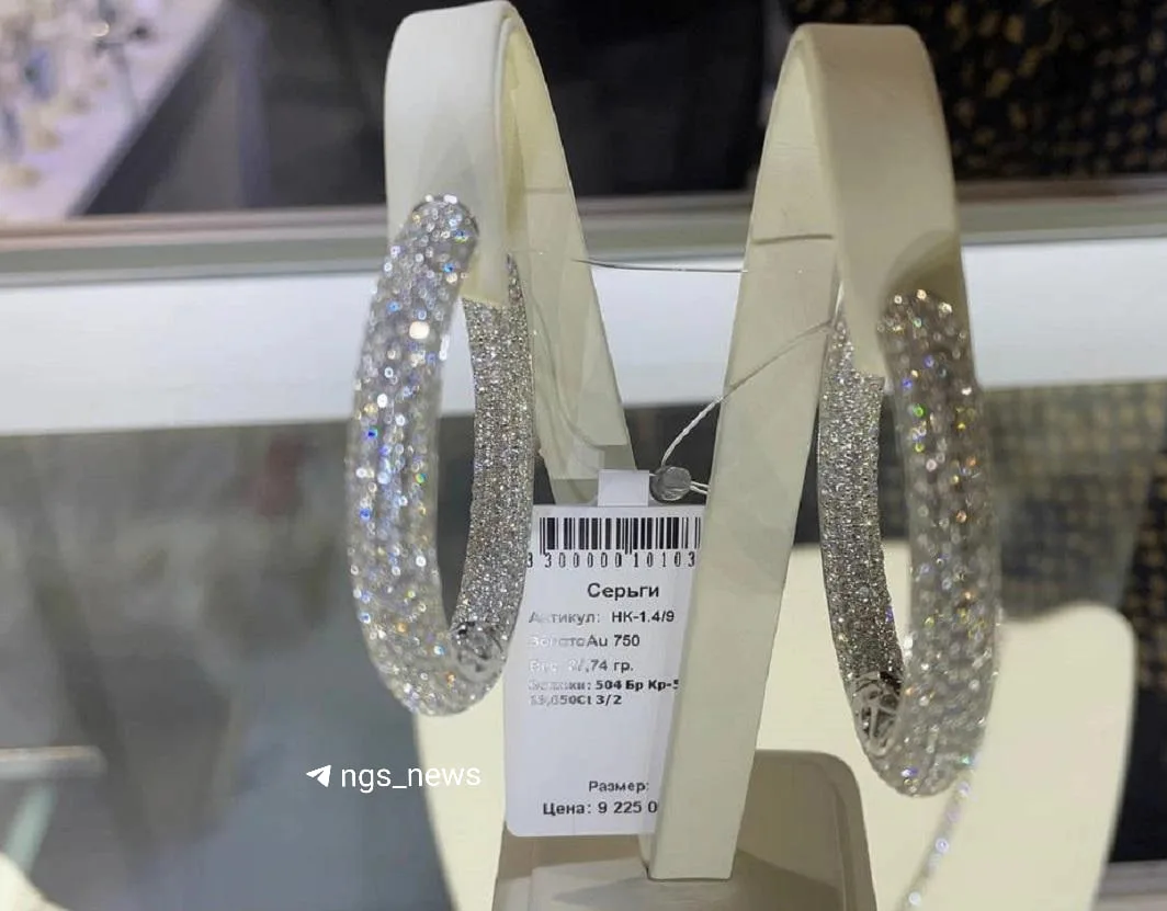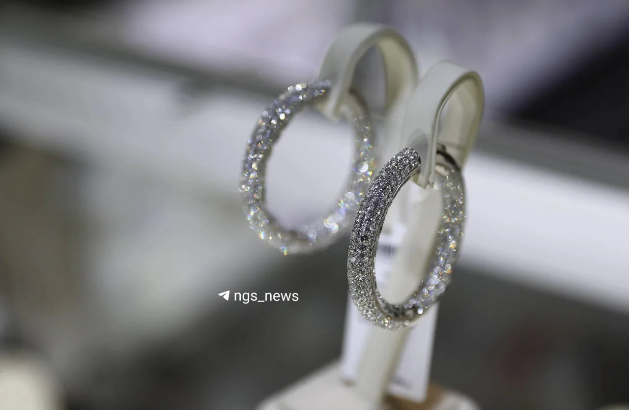 Серьги за 9 с лишним миллиона рублей показали на выставке «Ювелирная Сибири» в Экспоцентре. Это золото 750-й пробы и бриллианты производства «Саха Алмаз».